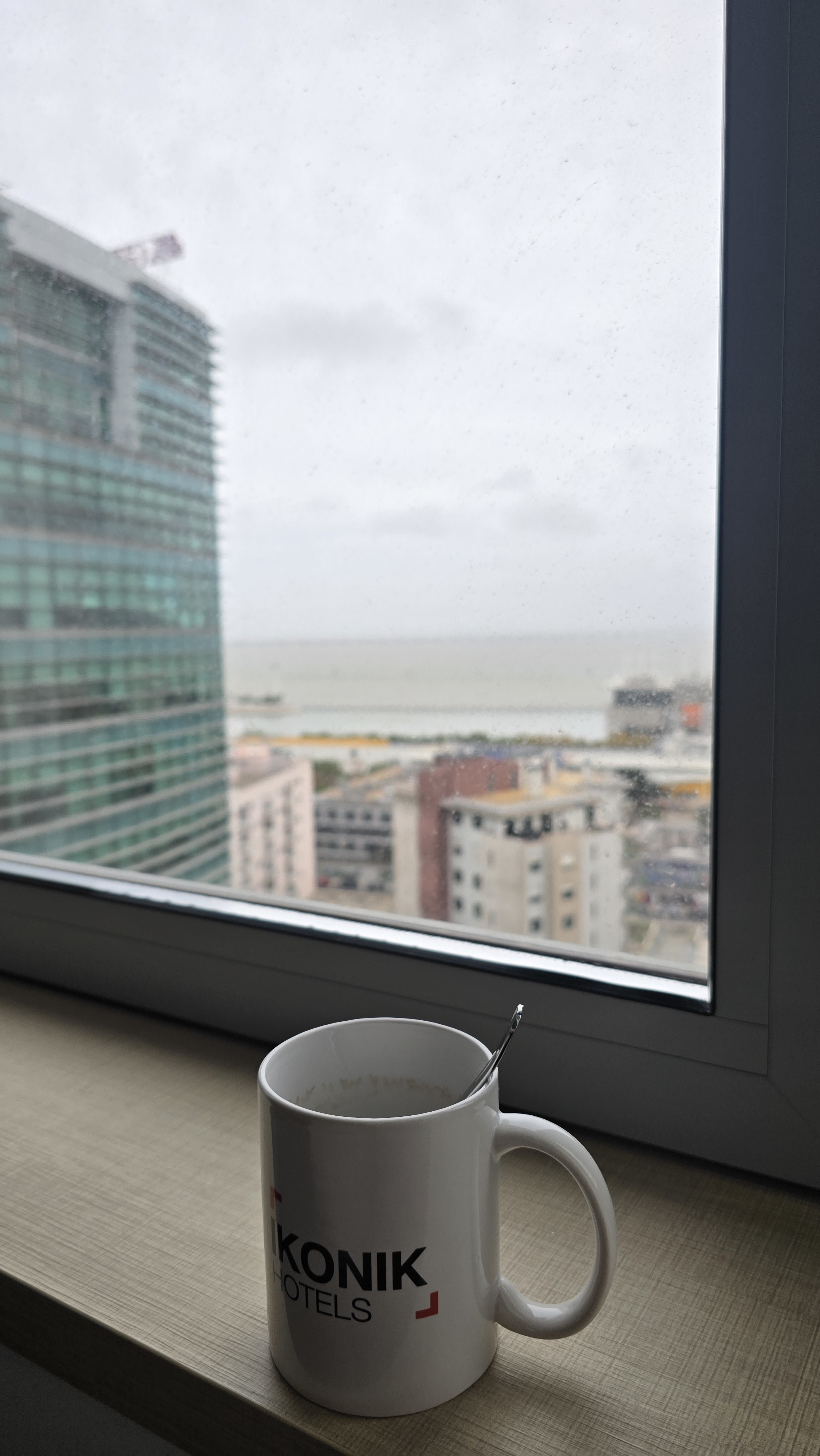 Adorámos o pormenor da caneca com o logótipo do hotel, um complemento perfeito para o stock generoso de café instantâneo disponível no quarto e, claro, a chaleira para ferver água. Não precisamos de mais para ser felizes, sobretudo num dia chuvoso.