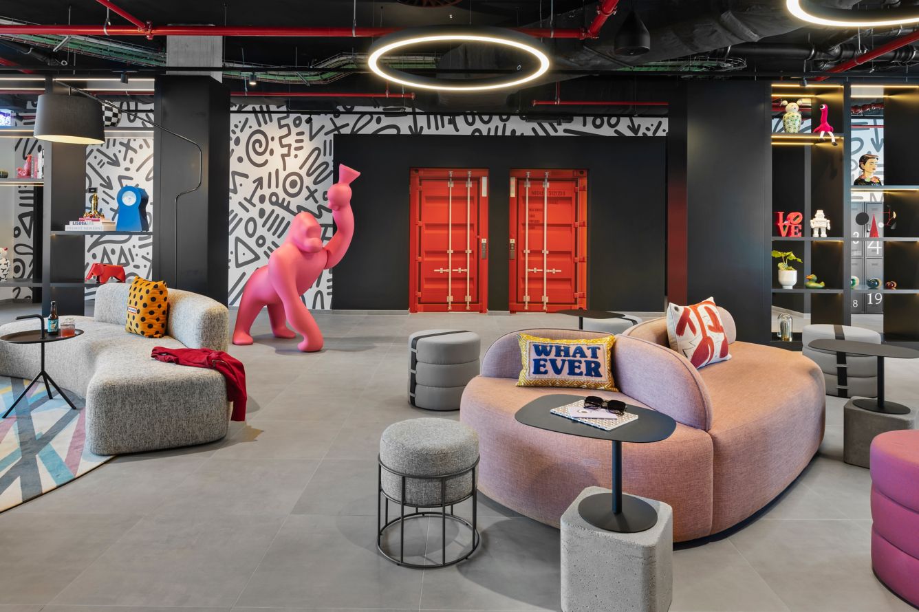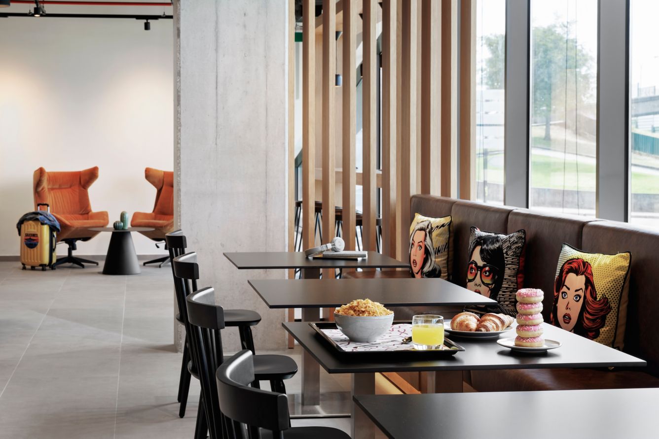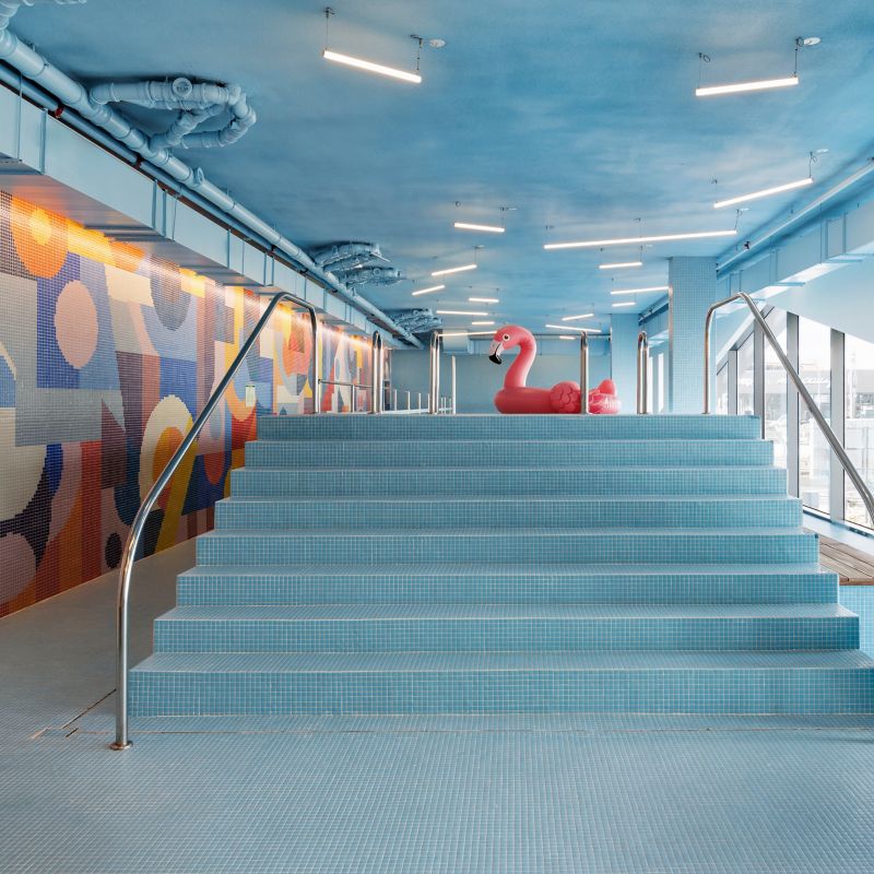 A decoração moderna e as soluções engenhosas de arrumação tornam o hotel descontraído e funcional, mas o que realmente o distingue é a piscina interior. De repente, deixamos de estar entre uma zona comercial e o IKEA e transportamo-nos para uma piscina em Miami. Insufláveis, cores garridas e luminosidade transformam o ambiente invernoso numa experiência divertida. E não, ninguém consegue subir num flamingo insuflável sem fazer algumas figuras tristes.