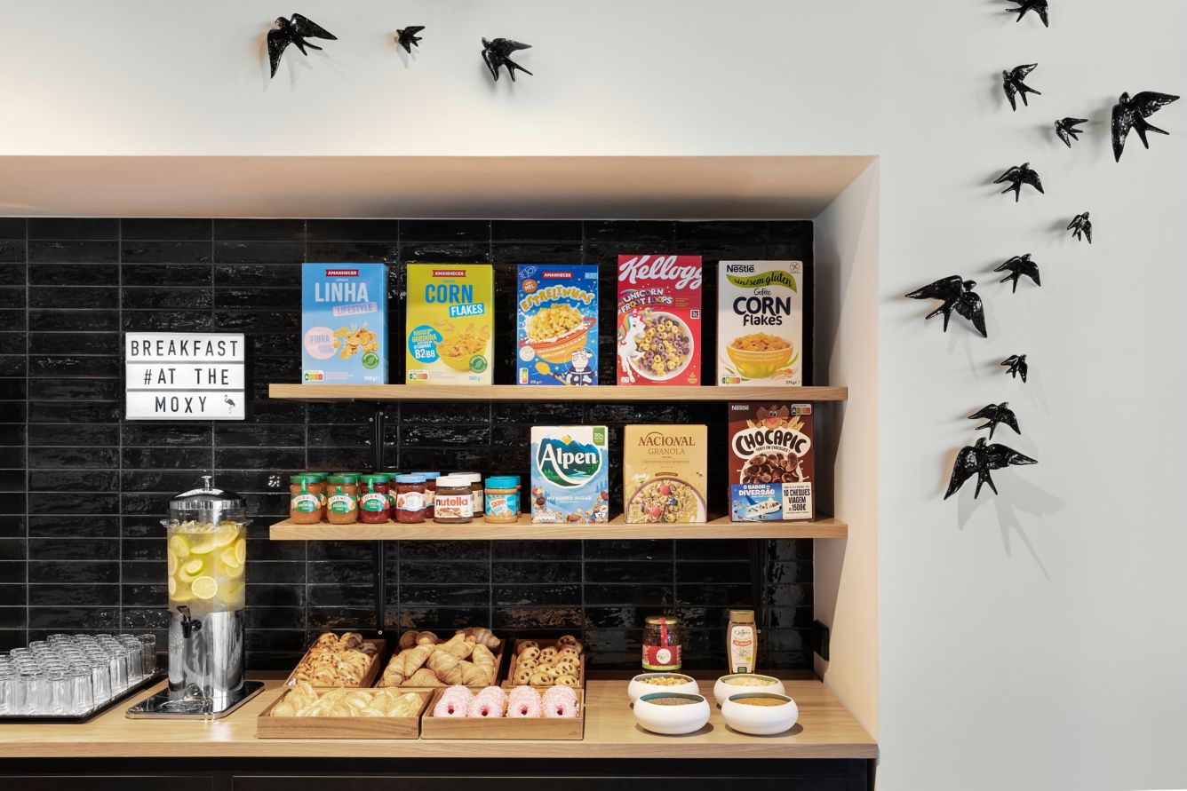 O pequeno-almoço é self service, variado e bastante aceitável (sim, há ovos e bacon). Pegue no tabuleiro, percorra o buffet e escolha uma mesa numa das grandes salas de convívio para desfrutar do início do dia. Outras comodidades incluem ginásio aberto 24 horas, bar, espaço para reuniões e uma loja de conveniência. Os preços começam nos 73€ em Quarto Moxy Queen (só alojamento) e 90€ com pequeno-almoço incluído, de acordo com simulação para a noite de 20 para 21 de dezembro para duas pessoas.