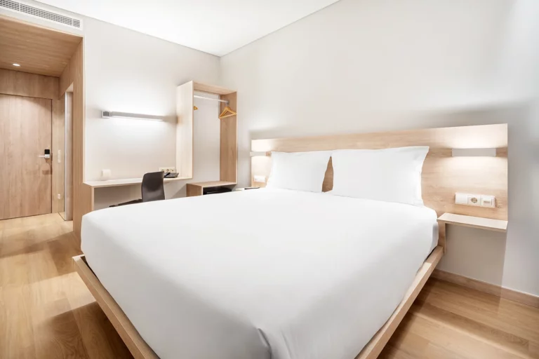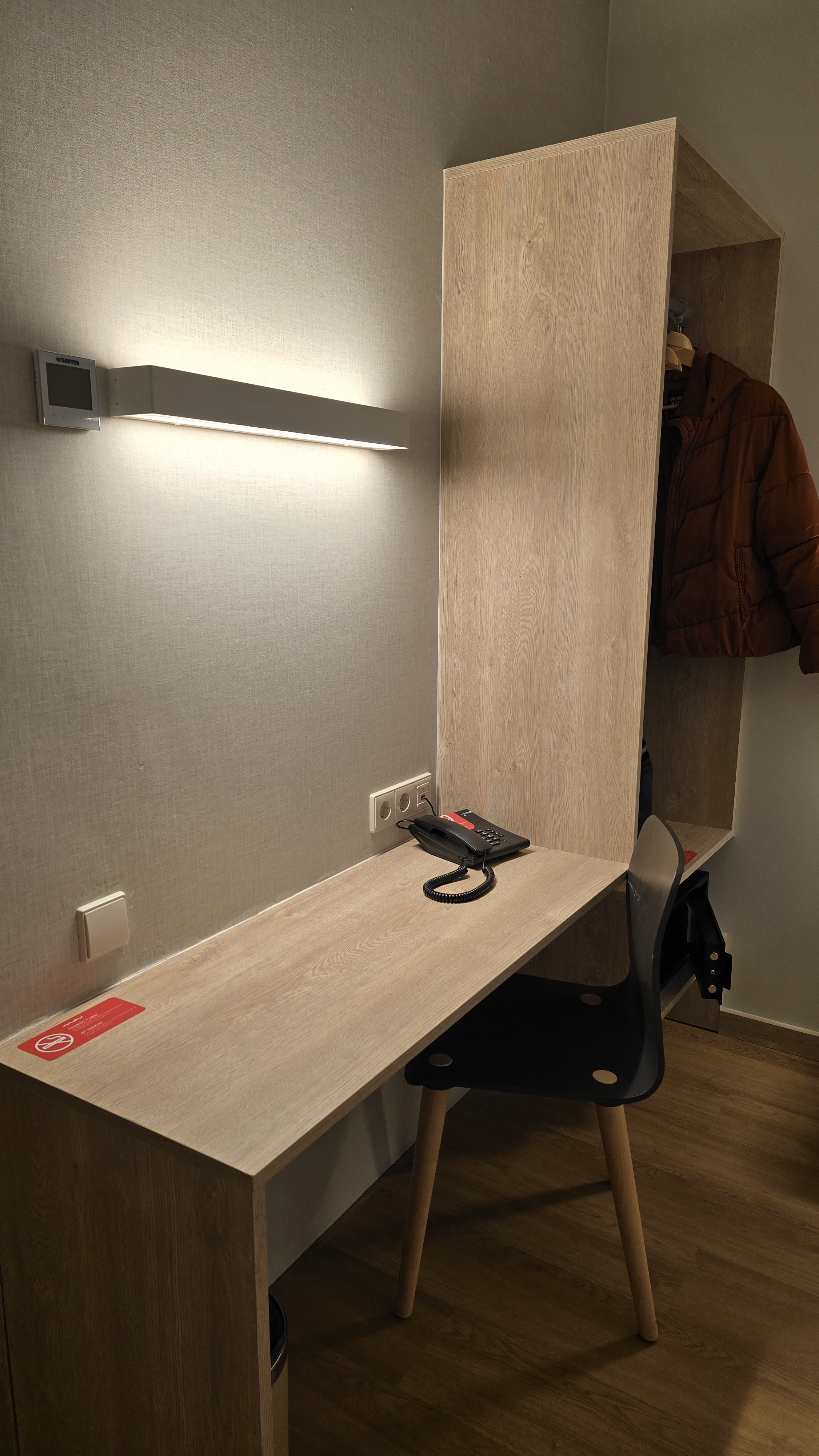 O hotel conta ainda com um pátio exterior onde é possível tomar o pequeno-almoço, relaxar ou trabalhar, e dispõe de espaços interiores que funcionam bem para quem precisa de abrir o portátil ou fazer uma reunião rápida. A receção funciona 24 horas e permite pagamento antecipado no check-in, o que torna o check-out numa tarefa de dois segundos. Basta deixar o cartão na caixa própria e seguir caminho.