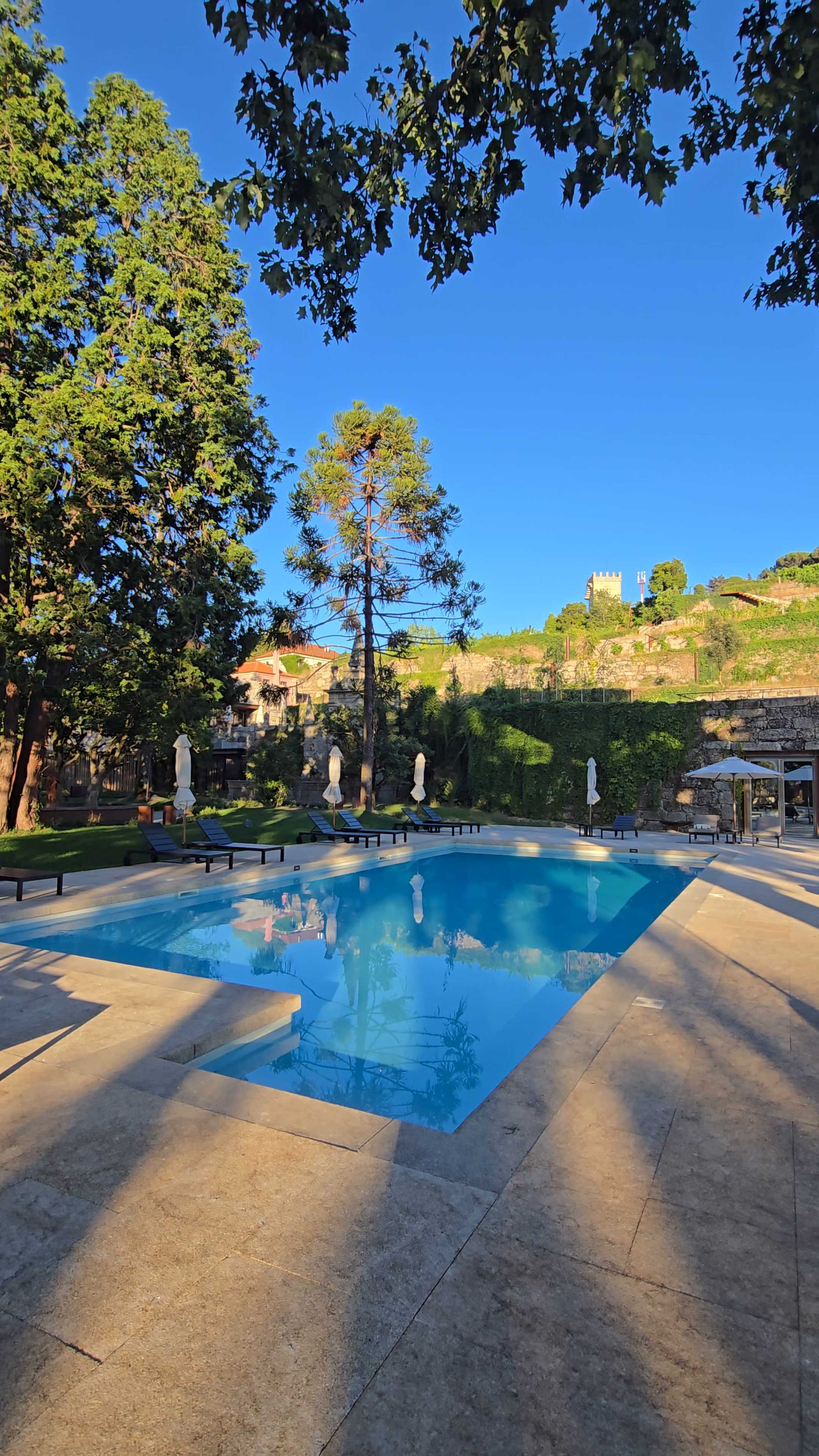 Nem grande, nem pequena. Perfeita. Rodeada de árvores e vegetação, mesmo ao pé do Tempo Wellness Center, para quem quiser completar um mergulho refrescante com uma ida ao ginásio, uma massagem ou mesmo uma passagem pela piscina interior ou sauna, a piscina exterior da Casa da Calçada é o refúgio perfeito para dias de maior calor. O terraço com vista para a cidade fica ali ao pé e, depois de subir pelo elevador, é como se estivéssemos no nosso palacete privado. Nós, o sol, a nossa espreguiçadeira, as toalhas fofas e incríveis do hotel, um livro e silêncio. Ah, e o bar da piscina ali mesmo à mão, para um cocktail ou um copo de vinho.