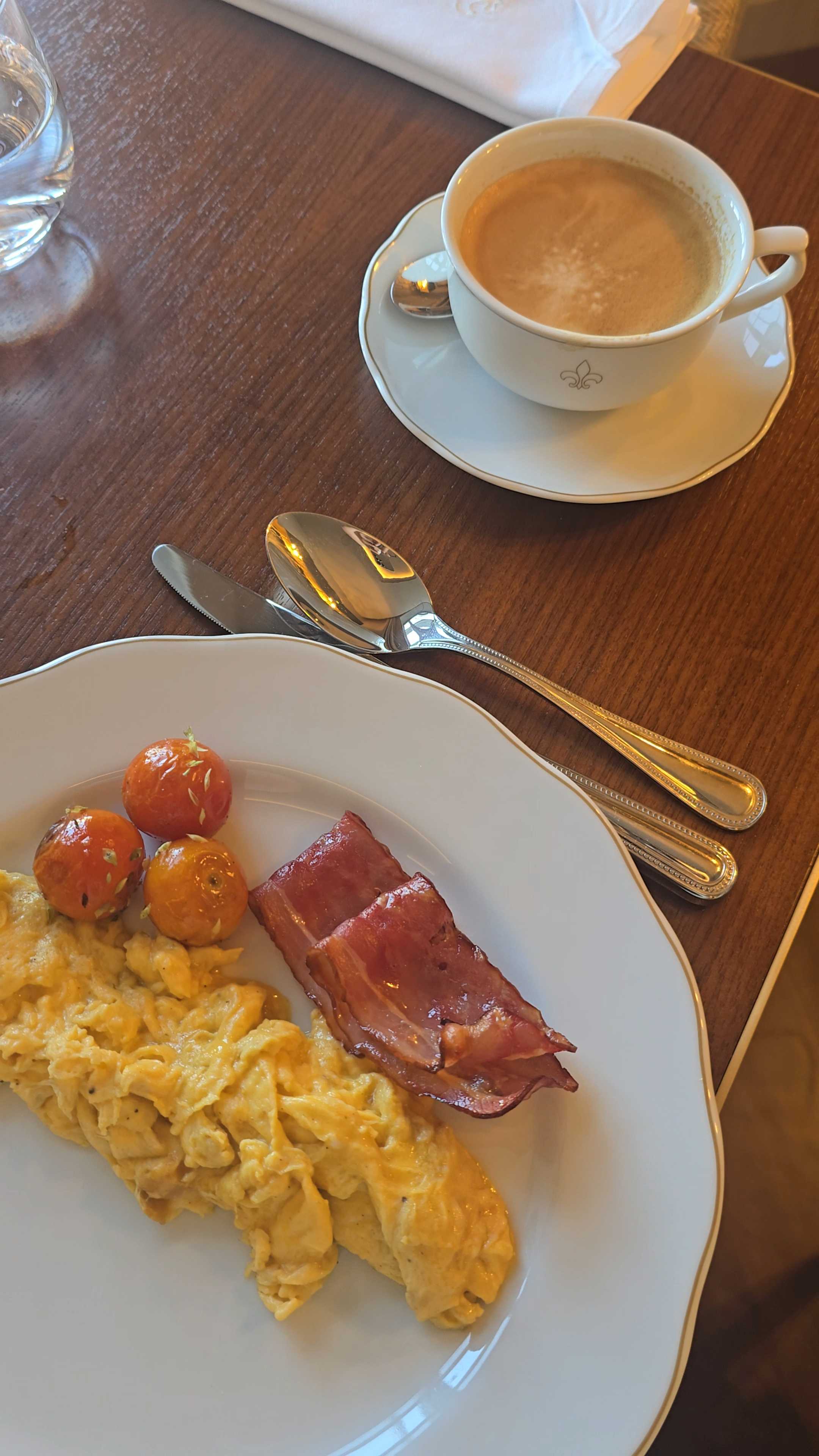 Temos de admitir que não ficámos impactados pelo pequeno-almoço da Casa da Calçada. O buffet disponível era interessante mas não tinha nenhum elemento que nos tivesse saltado à vista. Ficámos um bocado surpreendidos (pela negativa) quando pedimos um capuccino e nos trouxeram uma banal meia de leite. Não é que não gostemos de meia de leite mas... vá... não é a mesma coisa. Pedimos ovos com tomate e bacon e também não achámos incrível. Os ovos tinham demasiada gordura e o bacon estava resumido a duas tímidas fatias.