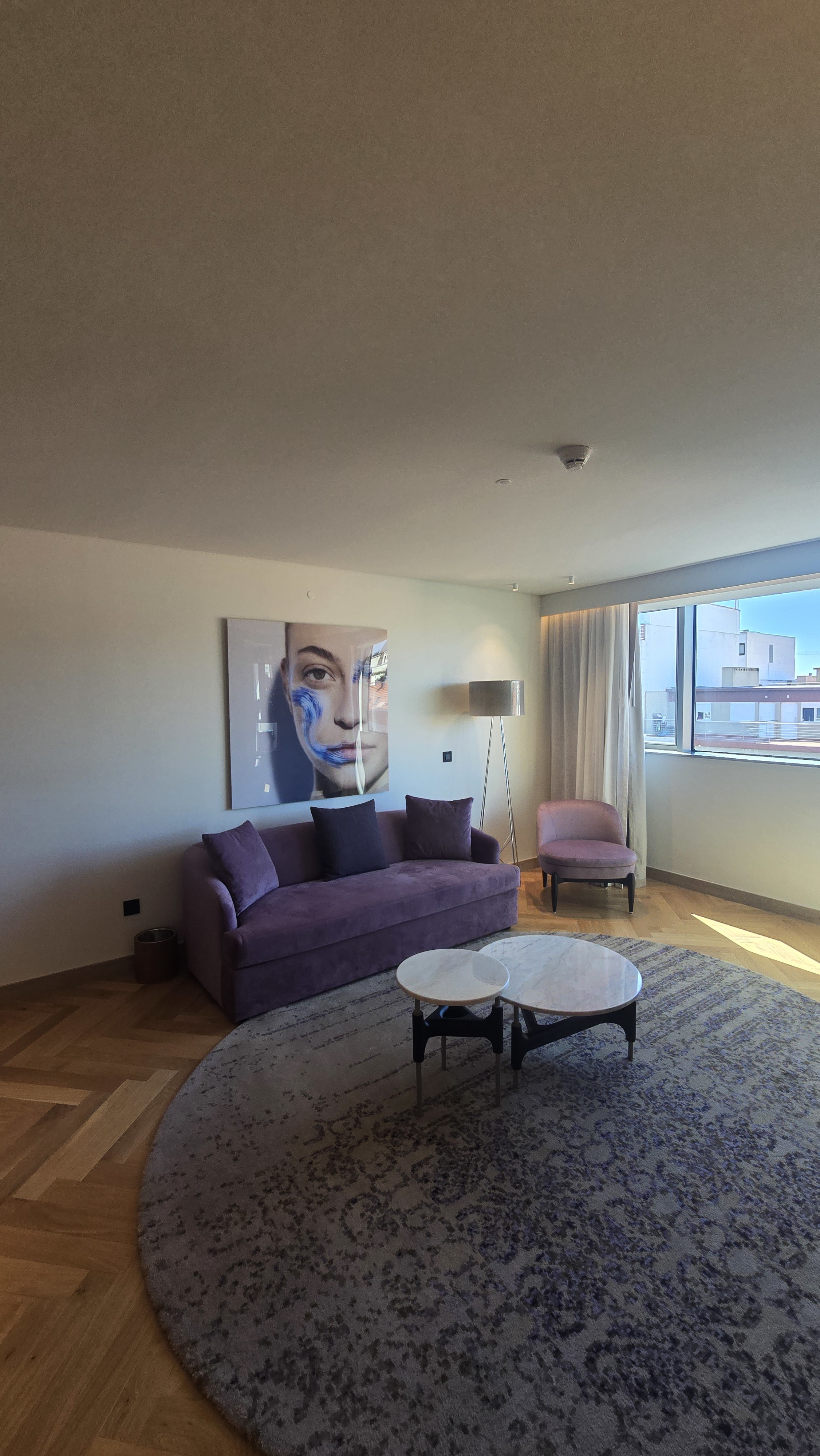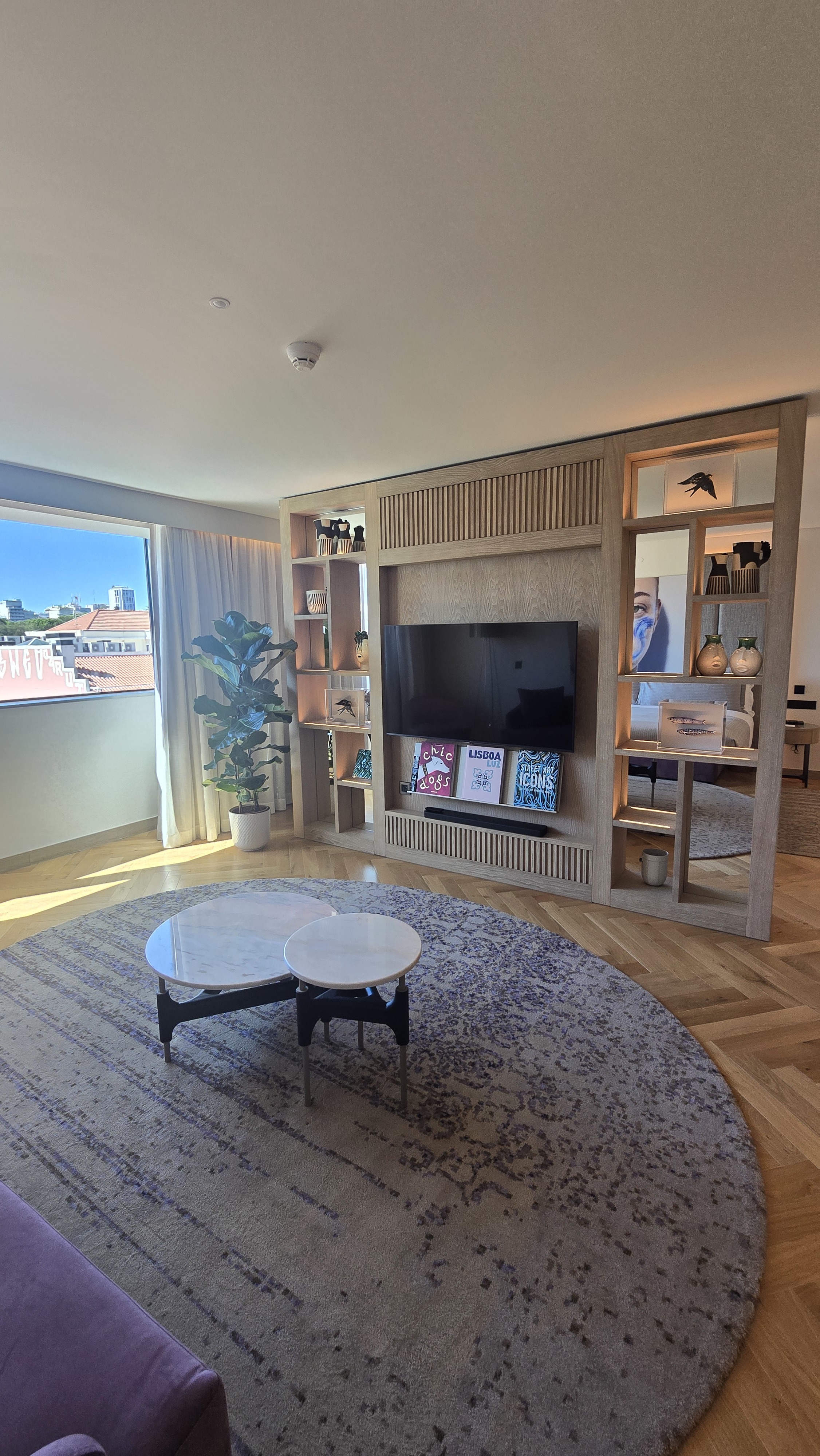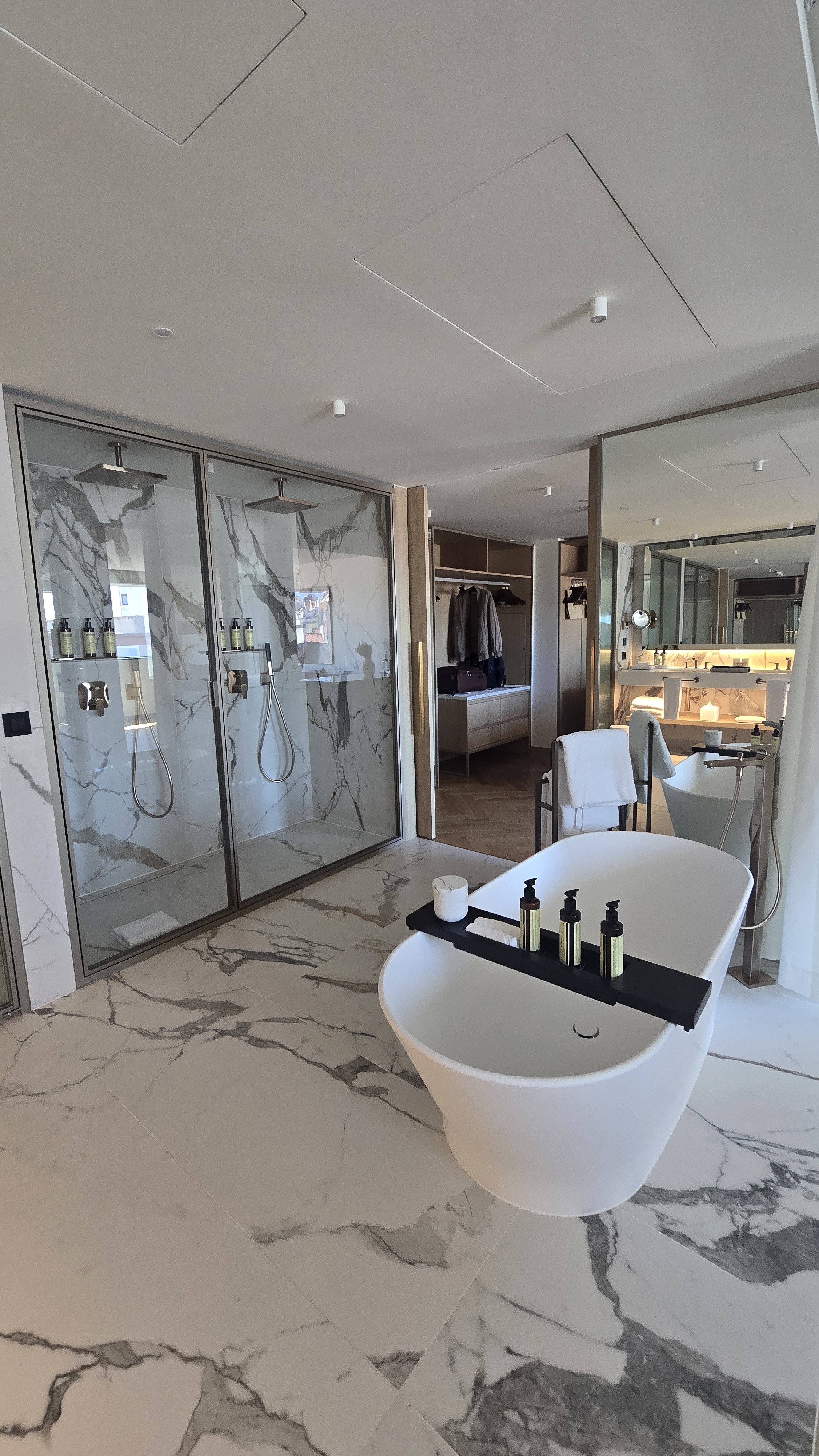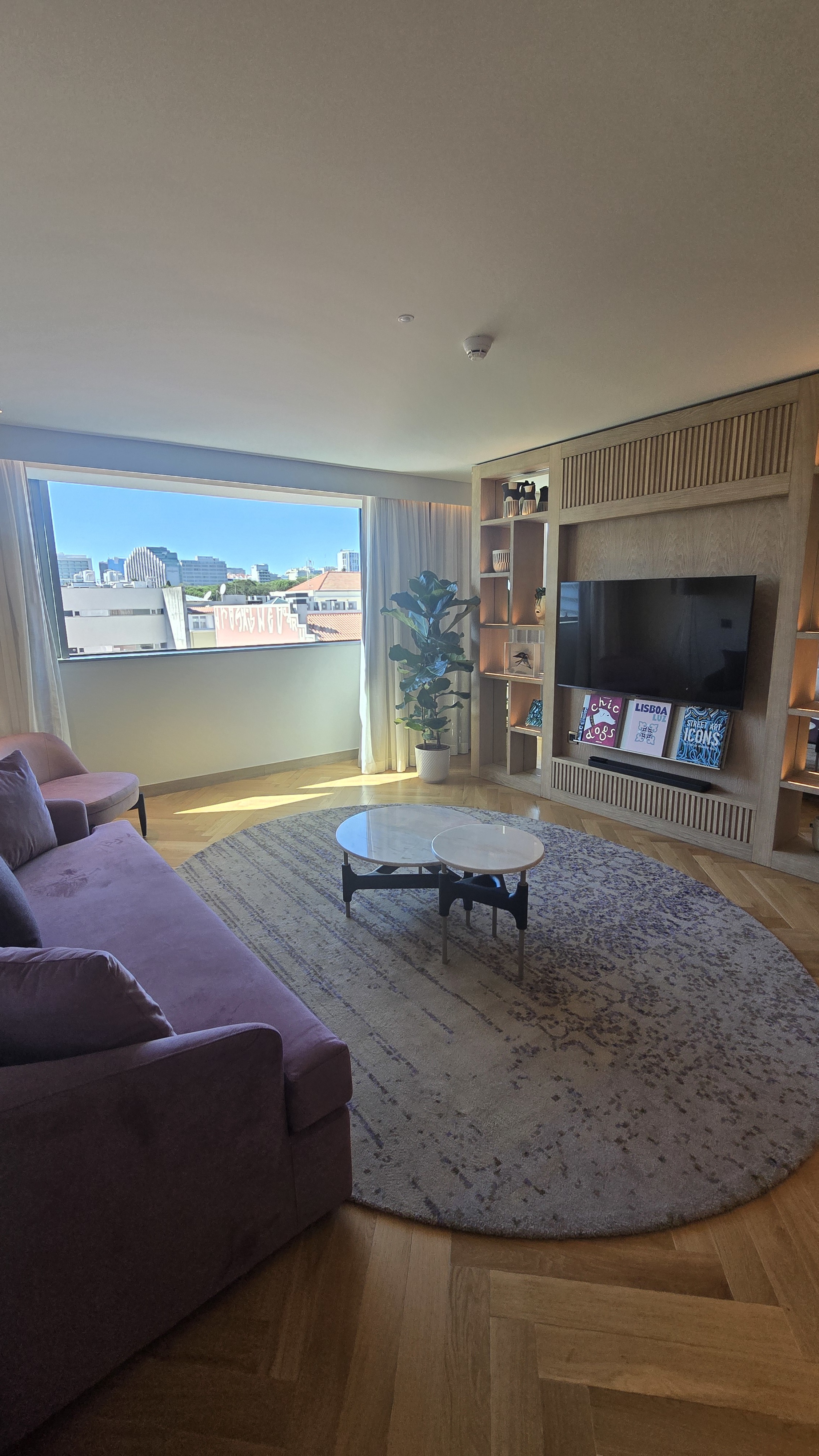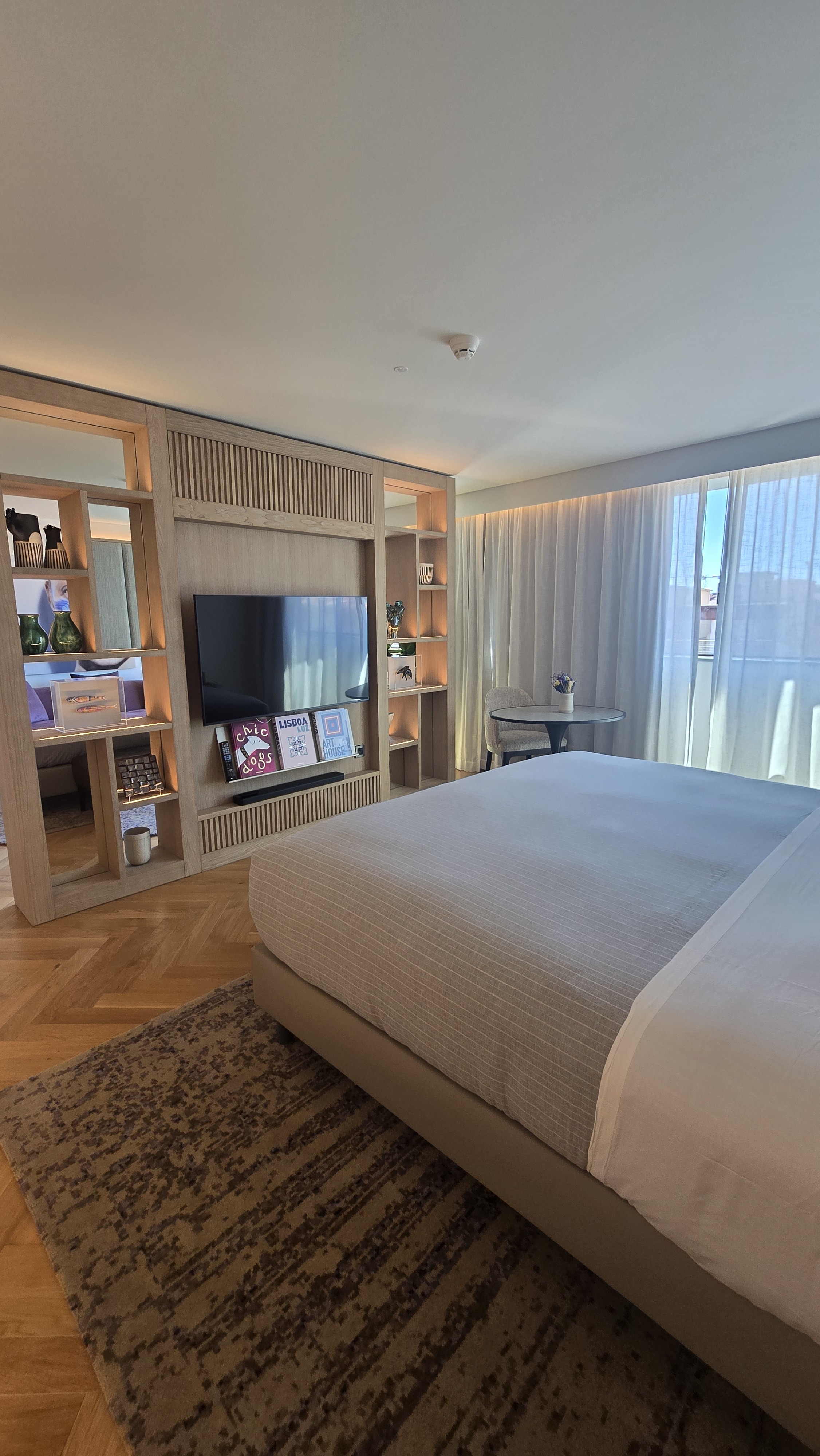 A suíte tem duas televisões, o que achámos um pouco extra, embora não nos tenha incomodado. Há uma planta natural, algo pouco comum num hotel de cidade, o que torna a estadia ainda mais especial. A casa de banho com chuveiro duplo e banheira no centro é o coração da suíte, convidando ao relaxamento total depois de um dia a passear (ou a trabalhar na cidade).