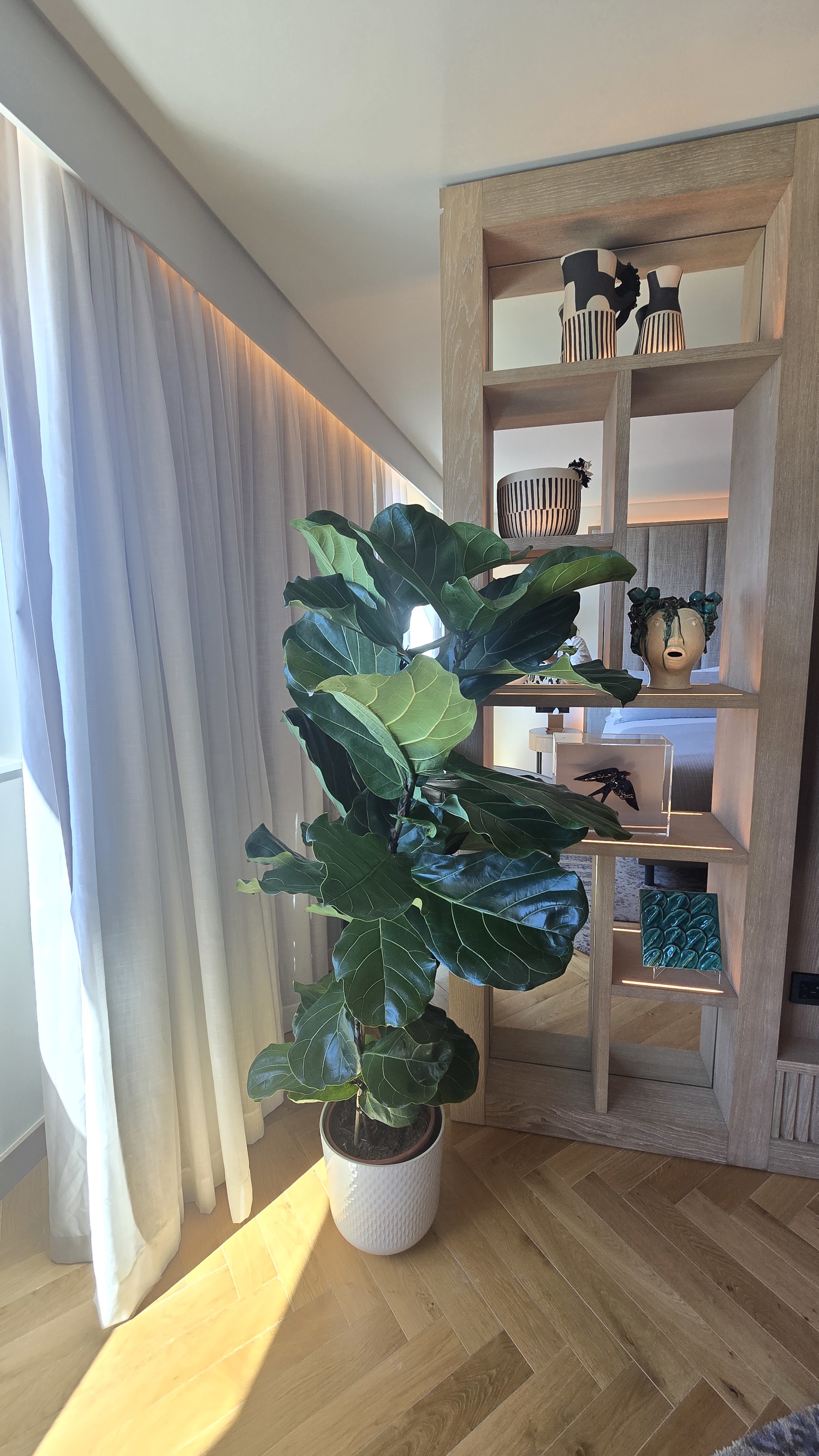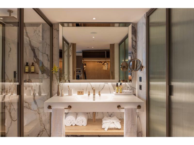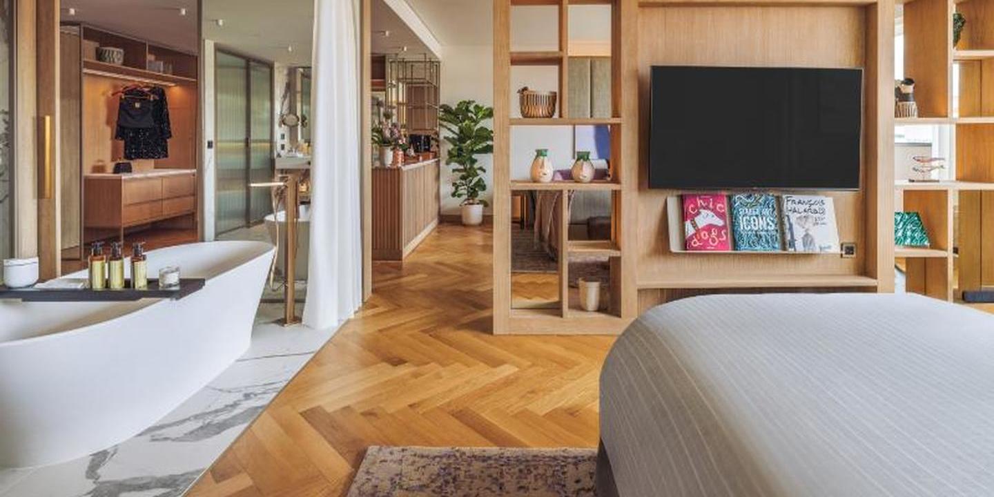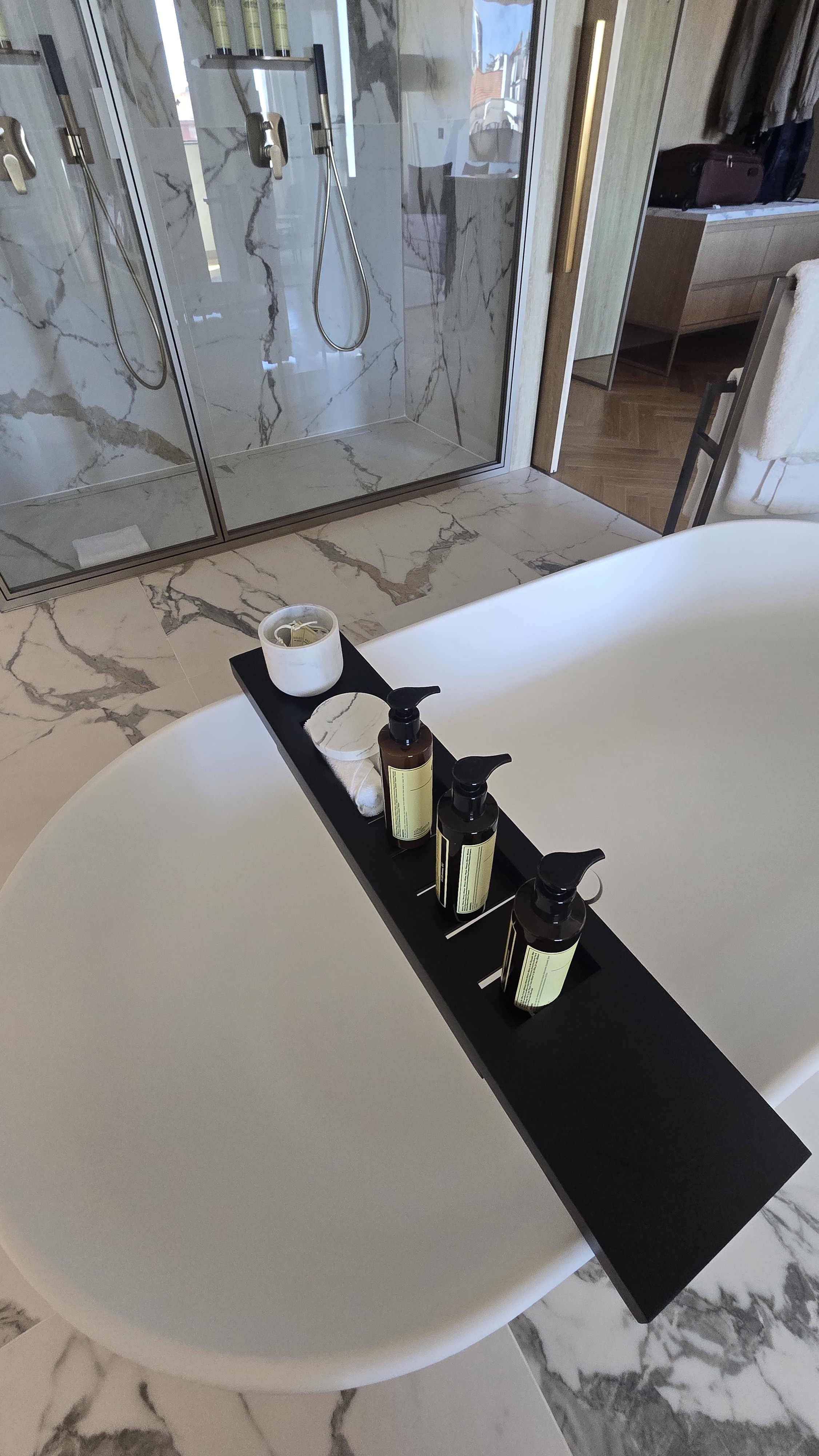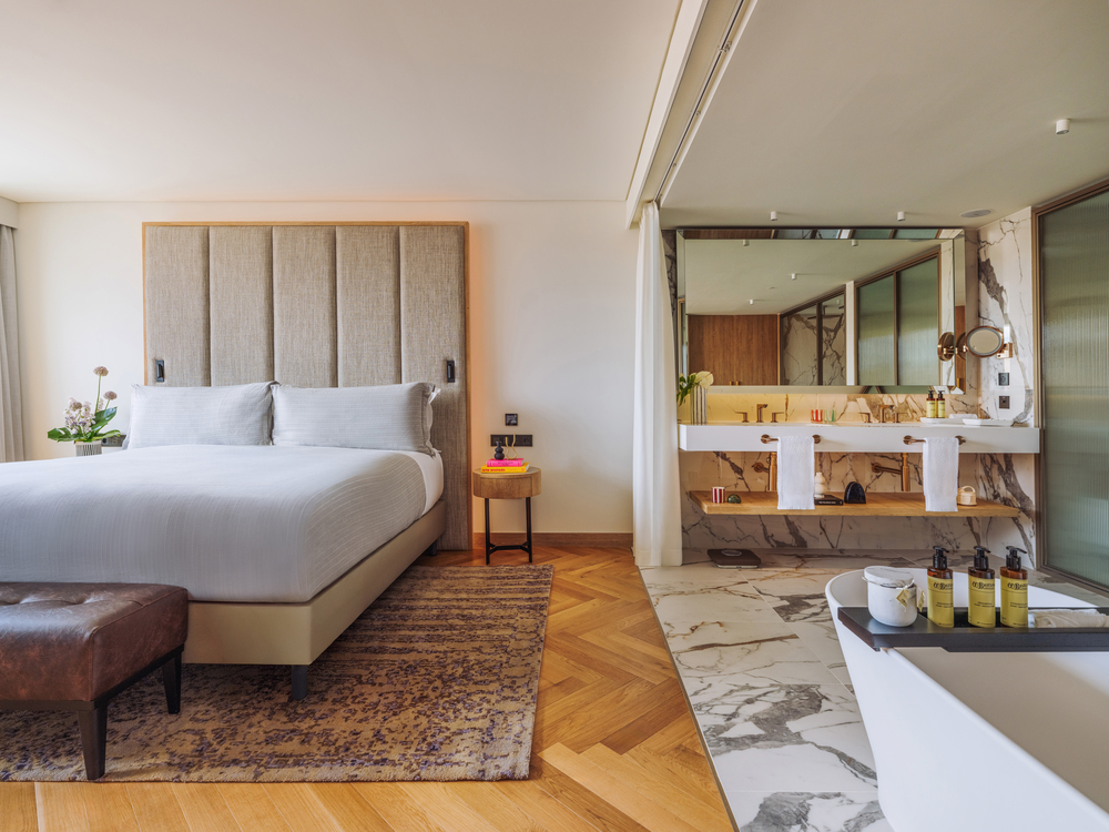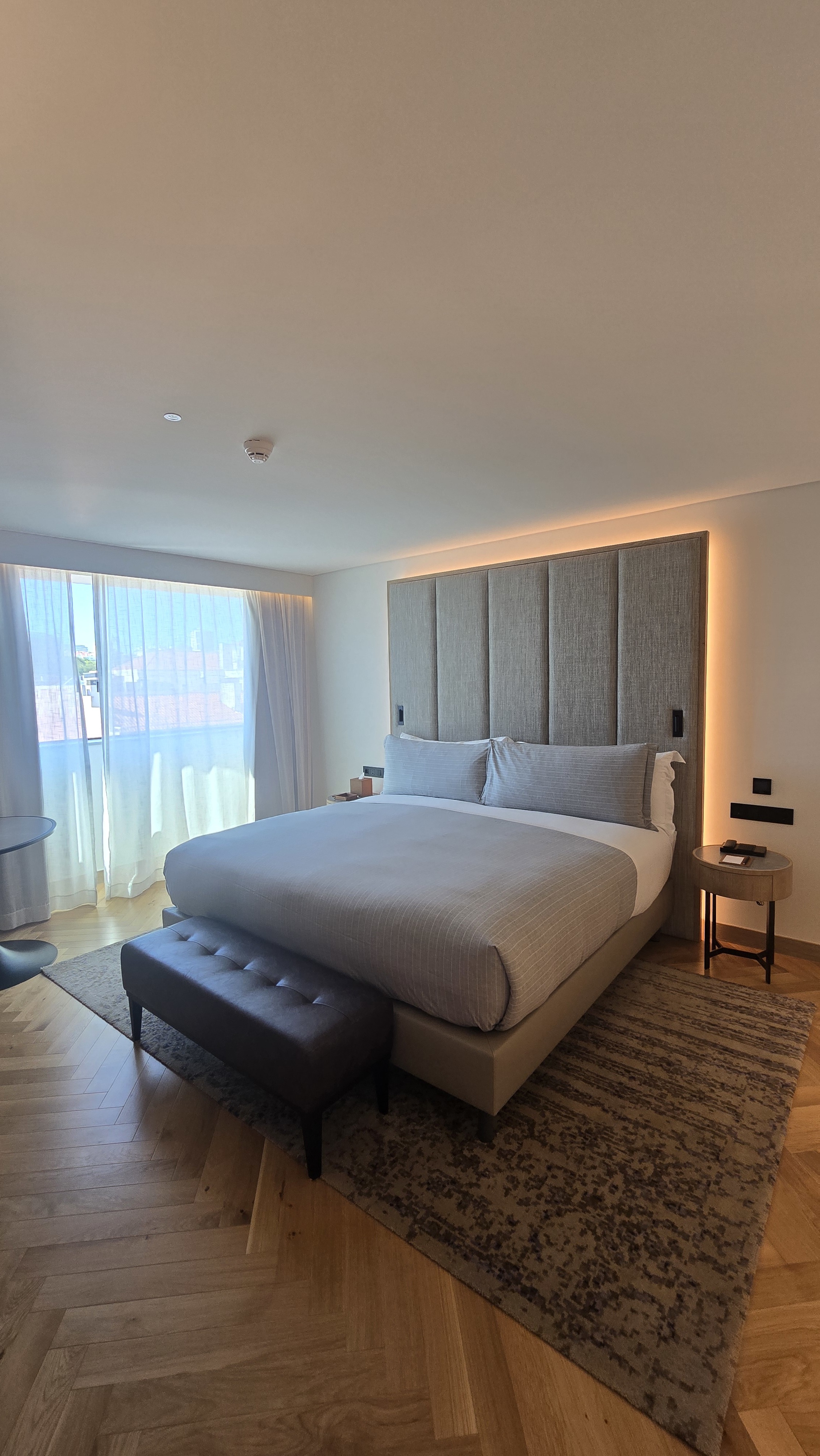 A suíte tem duas televisões, o que achámos um pouco extra, embora não nos tenha incomodado. Há uma planta natural, algo pouco comum num hotel de cidade, o que torna a estadia ainda mais especial. A casa de banho com chuveiro duplo e banheira no centro é o coração da suíte, convidando ao relaxamento total depois de um dia a passear (ou a trabalhar na cidade).