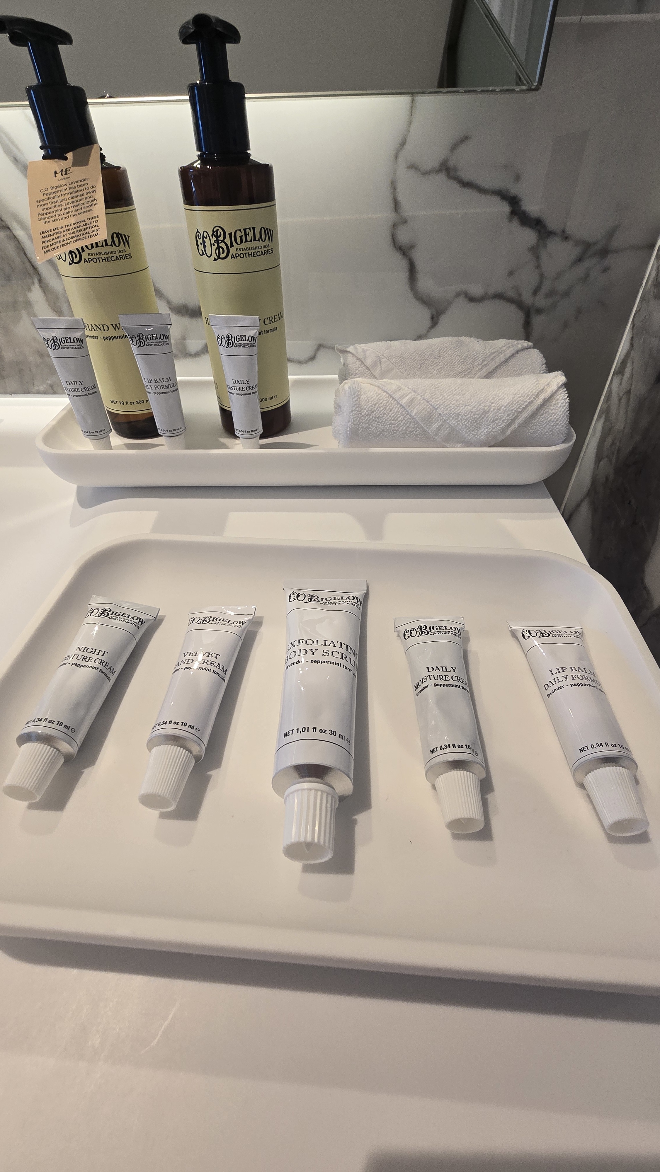 Experimentámos todos os produtos e ficámos completamente fãs do hidratante de rosto. Sem perfume, verdadeiramente hidratante sem deixar a pele gordurosa. A marca eleita pelo ME Lisbon para as amenities nos quartos e suítes é a norte-americana C.O. Bigelow. Nascida em 1838, em Greenwich Village (Nova Iorque) enquanto loja, The Village Apothecary Shoppe, é uma das mais antigas do género nos EUA. Ao longo dos anos, manteve fórmulas tradicionais e atenção personalizada, preservando a herança farmacêutica enquanto adapta receitas históricas aos desafios do século XXI. A melhor parte? Dá para encomendar online.