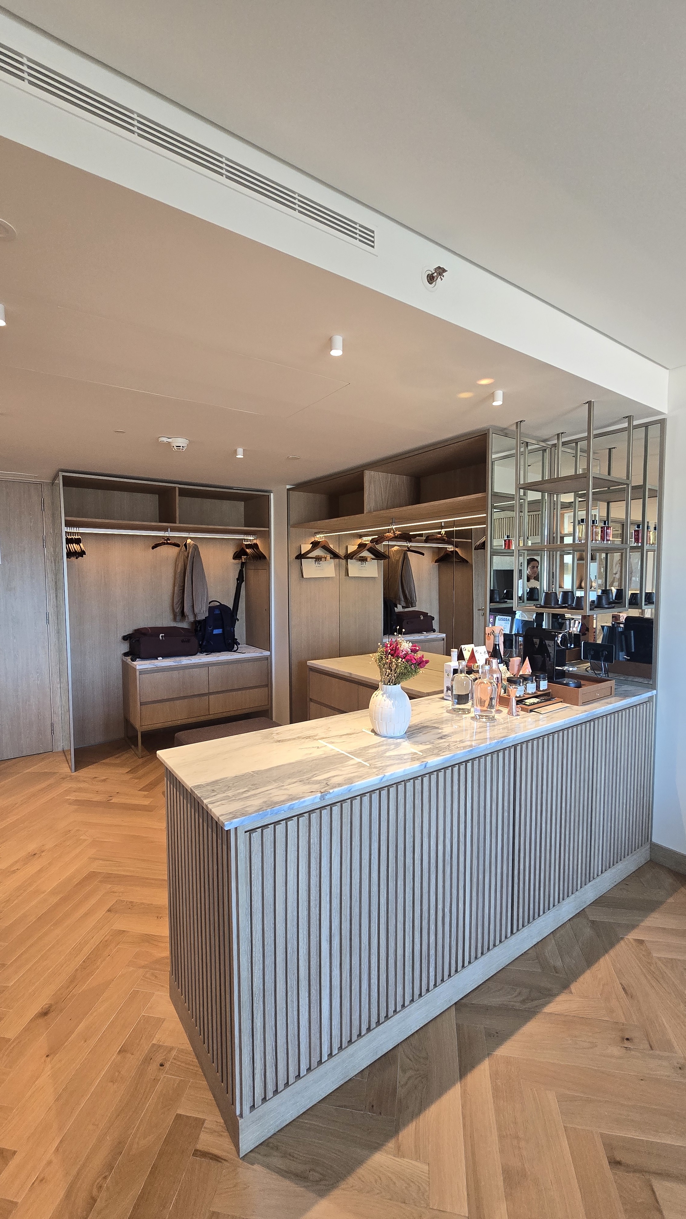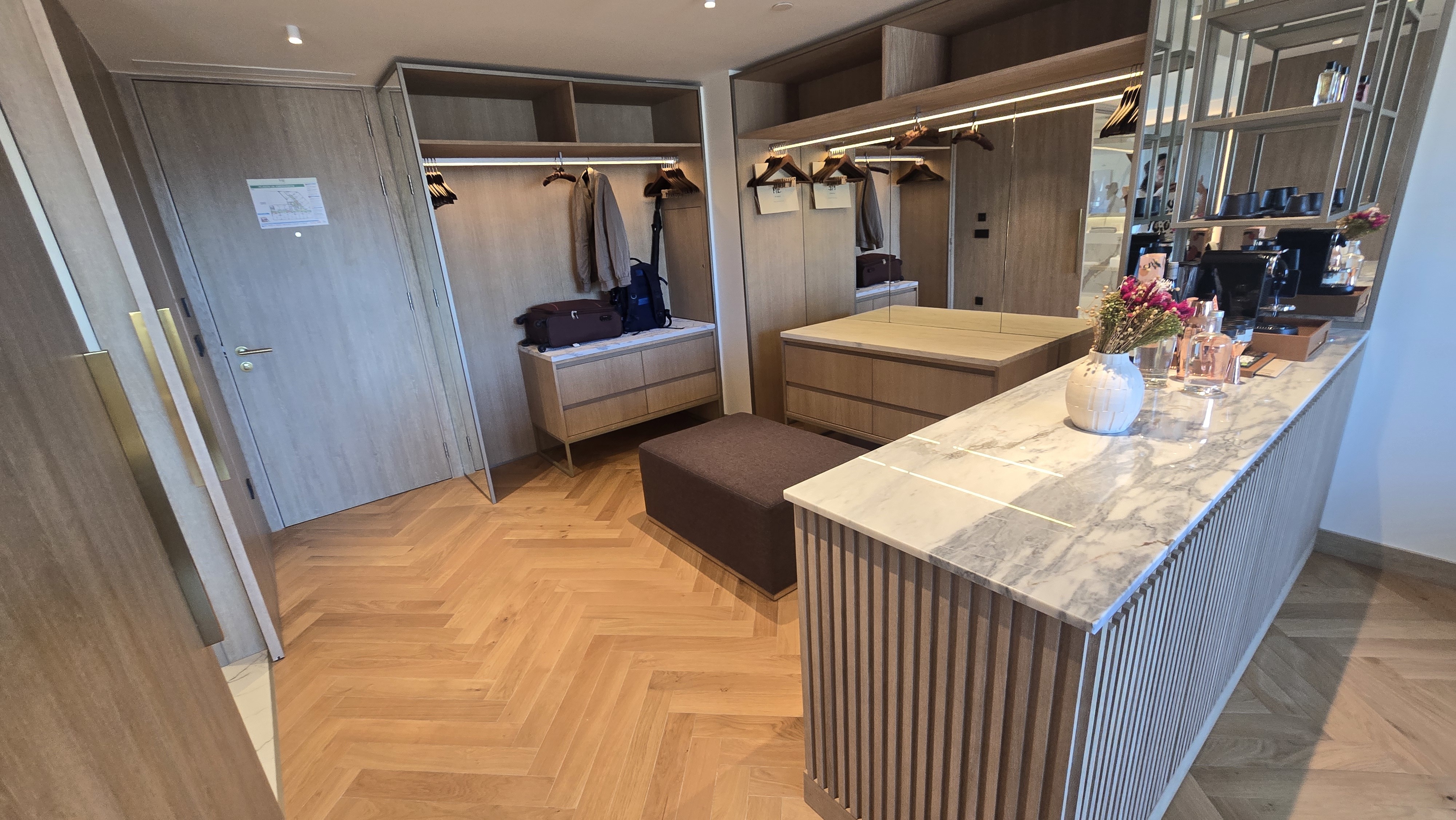 Além de um painel de controlo das luzes e ar condicionado que conseguimos realmente perceber sem ter de ler o manual de instruções, o que chama a atenção, assim que entramos na suíte, é a disposição invulgar do espaço. Assim que entramos, encontramos o espaço de arrumação, o que faz todo o sentido por questões de higiene. Os sapatos e a bagagem, os casacos e tudo o resto fica logo ali, para descanso e serenidade totais. Segue-se a zona do bar, a sala de estar, com uma estante que ser de separação entre a zona de lazer e a de descanso.