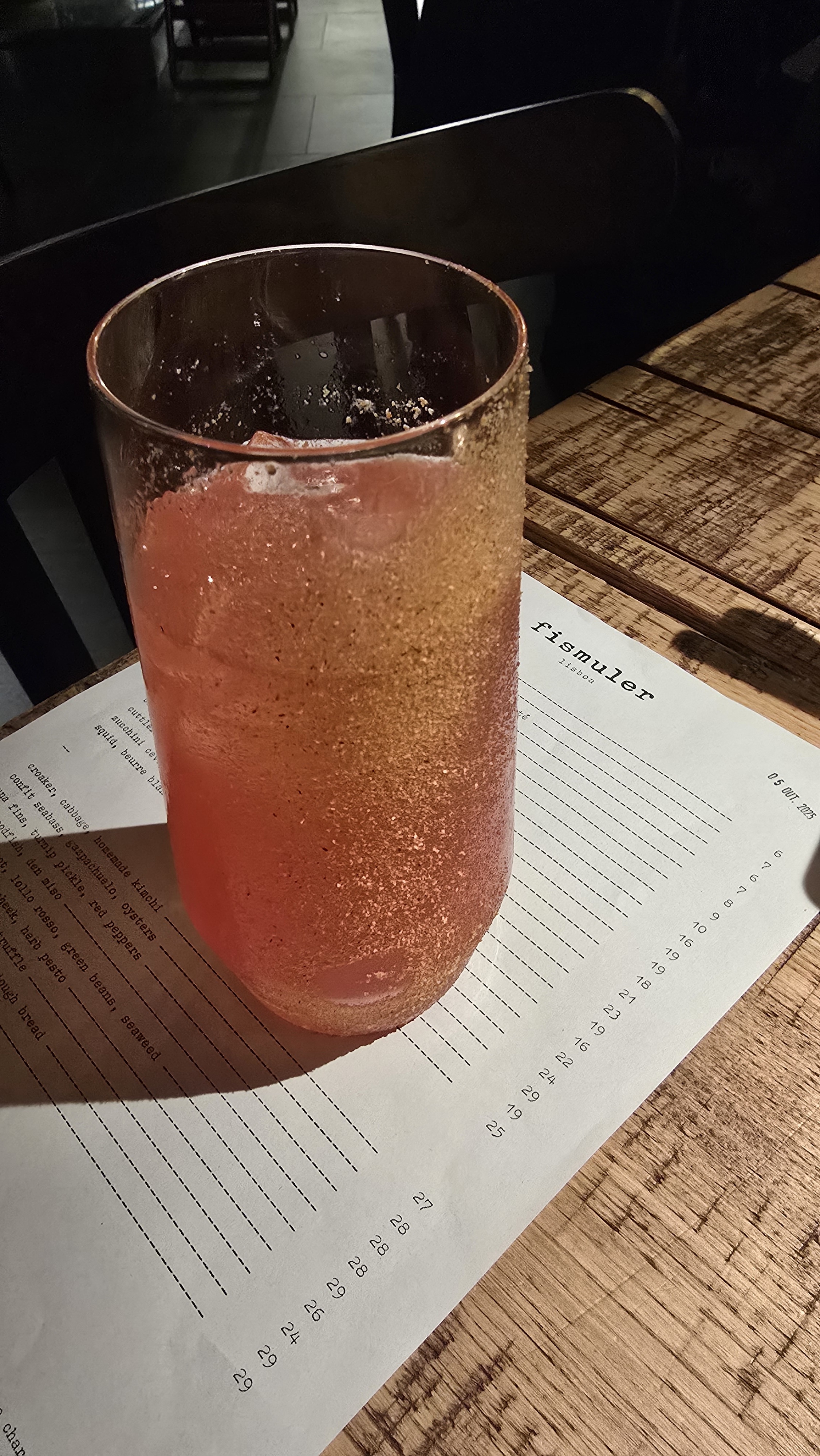 Depois de um couvert com pão delicioso, manteiga e um paté de fígado de porco ótimo, provámos o arroz malandro de choco com caranguejo frito (29€). Apurado e delicioso e só não provámos mais pratos porque nos estávamos a guardar para o escalope. E não podemos sair do Fismuler sem ser a rebolar, razão pela qual terminámos a refeição a intensa e pecaminosa tarta de queso Fismuler (8€). Doce e salgada, gulosa. Fujam. Para ajudar a digerir a refeição, acompanhámos com um mocktail (cocktail sem álcool) Paloma Spicy. Ótimo e spicy.