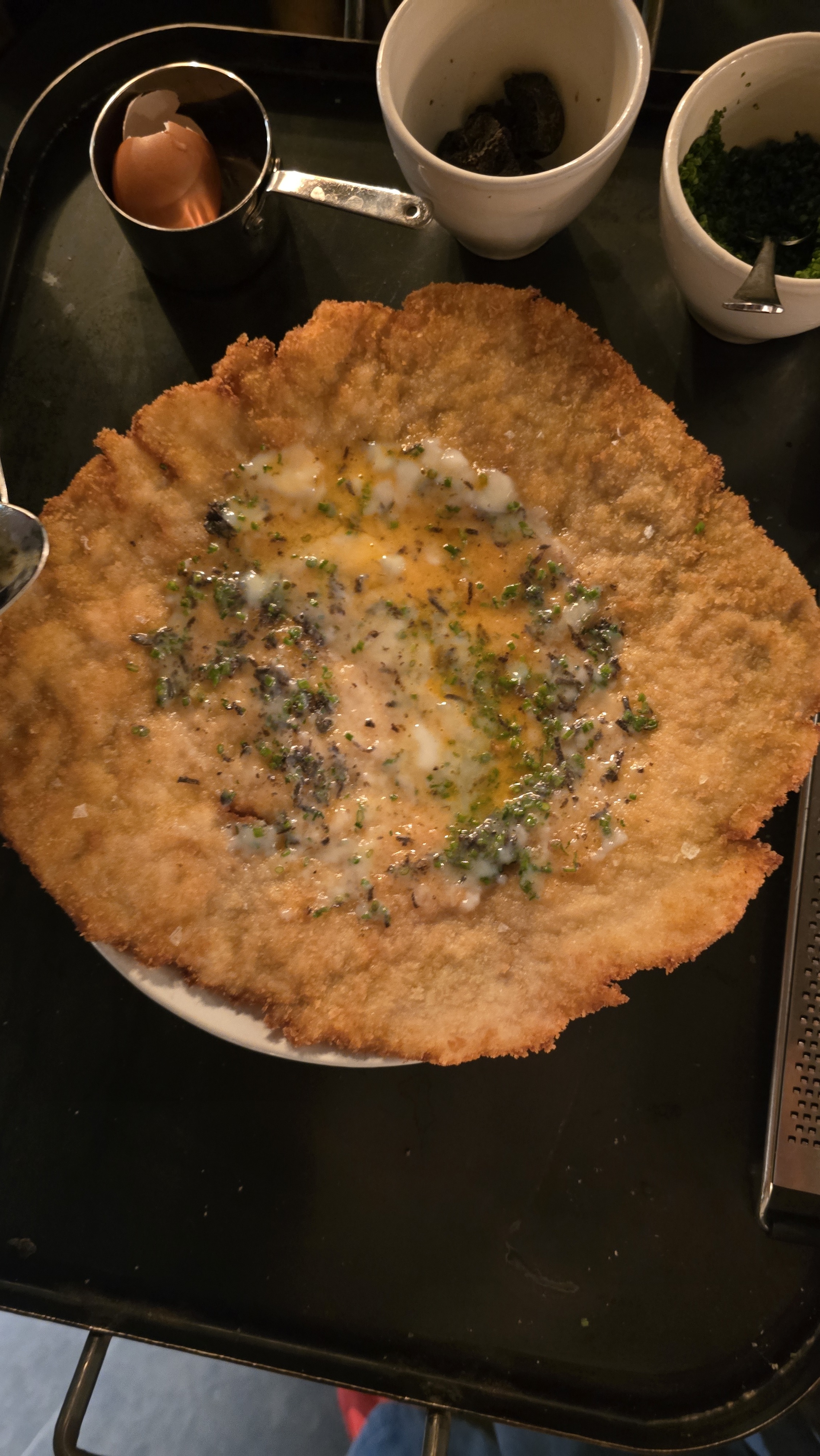 Depois de Madrid e Barcelona, o Fismuler chega a Lisboa, trazendo uma gastronomia cosmopolita e uma carta que muda todos os dias. O restaurante, situado no rés-do-chão, é o coração do ME Lisbon. Do pequeno-almoço ao jantar, é ali que se fazem as refeições deliciosas e surpreendentes, com música que vai mudando ao longo do dia, para criar o ambiente certo. E também atuações ao vivo. Ah, e claro, pratos instagramável. Começamos pelo mais fotogrável de todos, o panado gigante. Ou, como surge na carta, escalope San Román, trufa, ovo (29€). A gigante proteína panada vem para a mesa com pompa e circunstância, para depois ser vestida com ovo e uma camada generosa de trufa. Se é bom? É pecaminosamente bom e obrigatório numa visita ao Fismuler.
