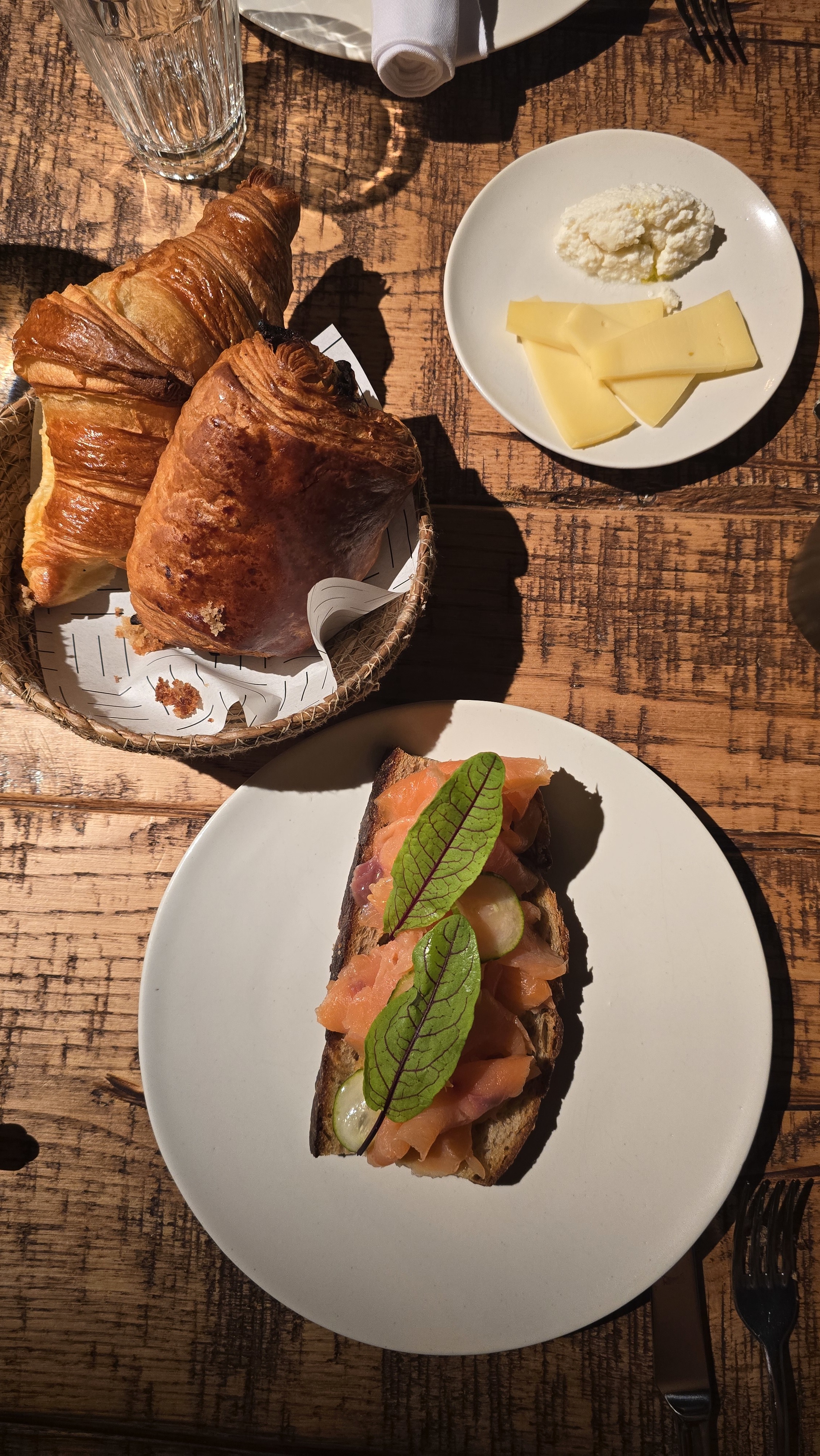 Depois vem o momento mais difícil — escolher apenas dois pratos feitos no momento. Mas a nossa escolha recaiu na tosta de salmão com pickles de pepino e foi uma surpresa: fresca, equilibrada e absolutamente deliciosa. Só lamentámos não ter tempo para ficar mais um pouco, mas tínhamos um voo para apanhar — qual influencer apressada, rumo a mais uma viagem de influencing.