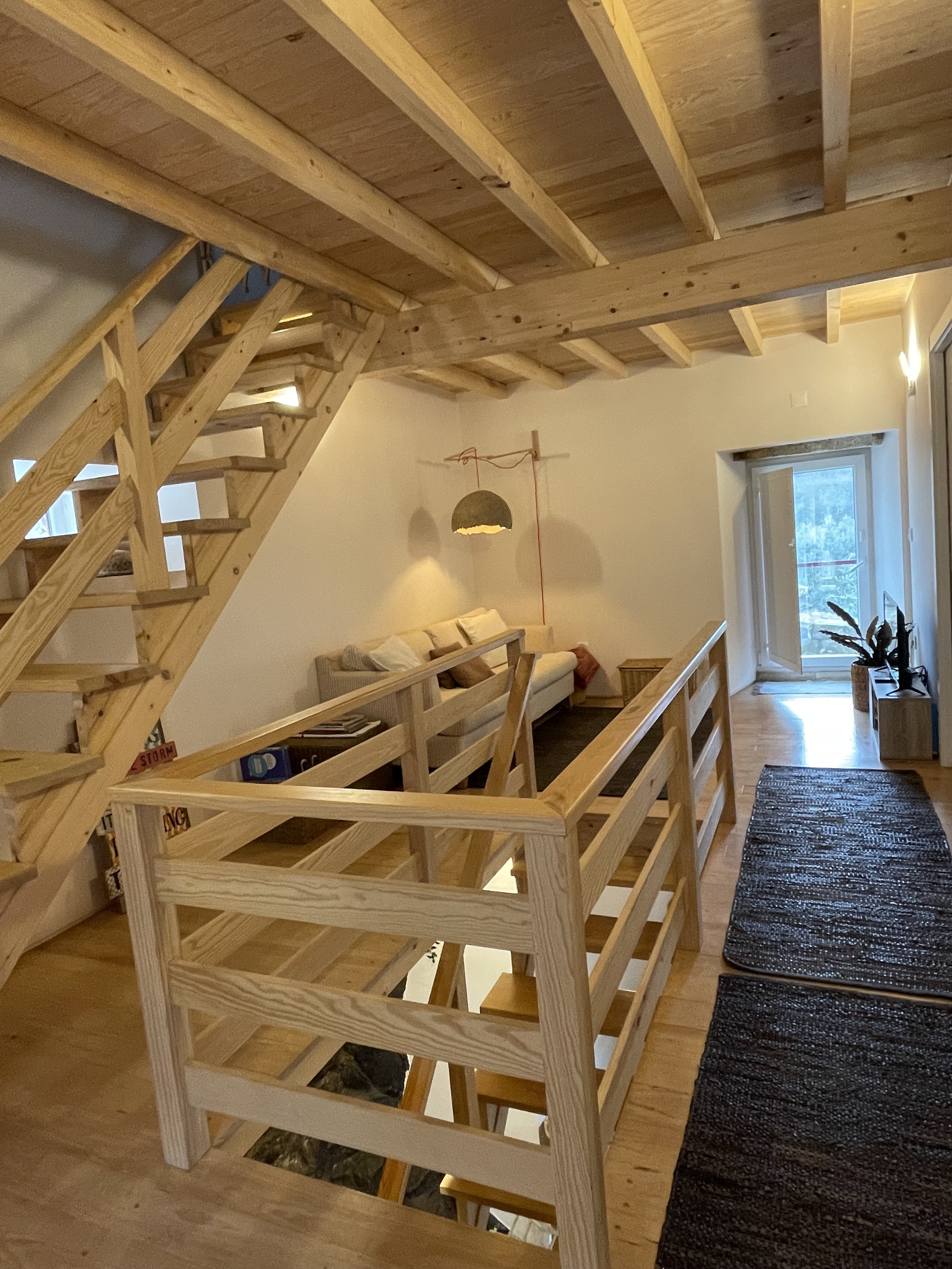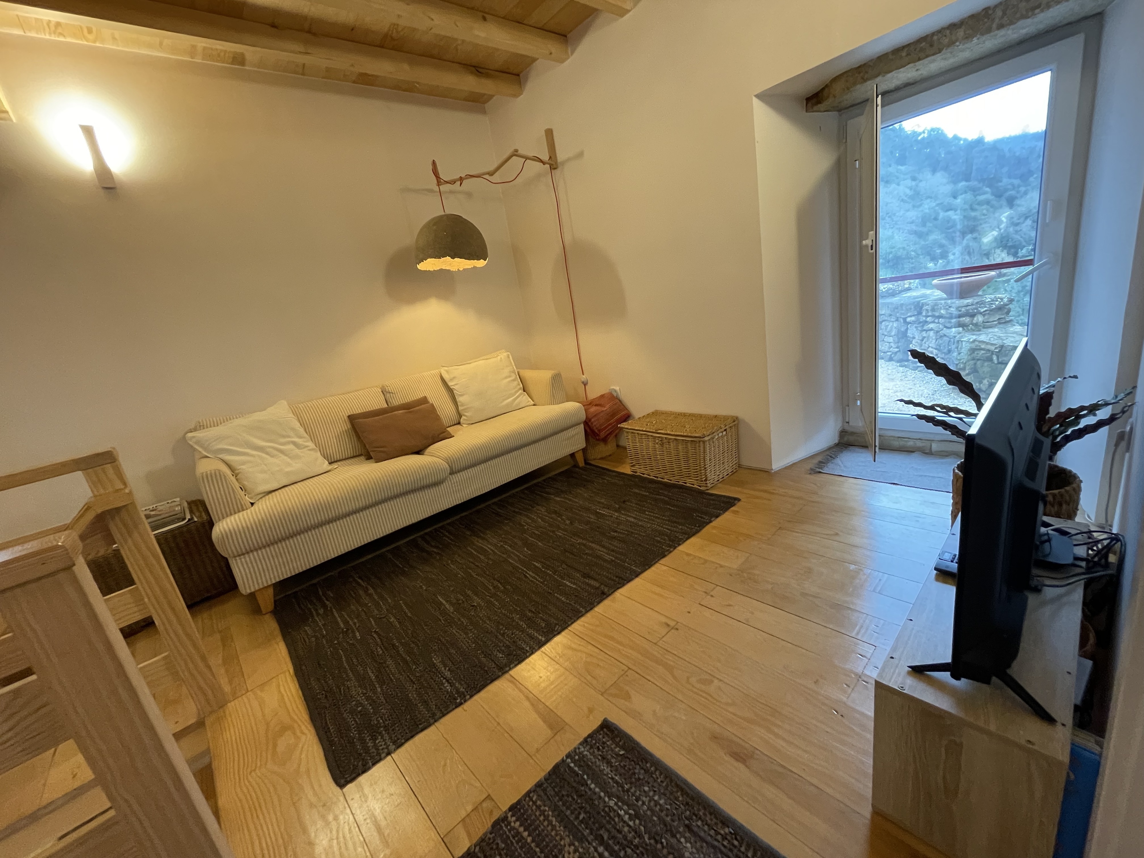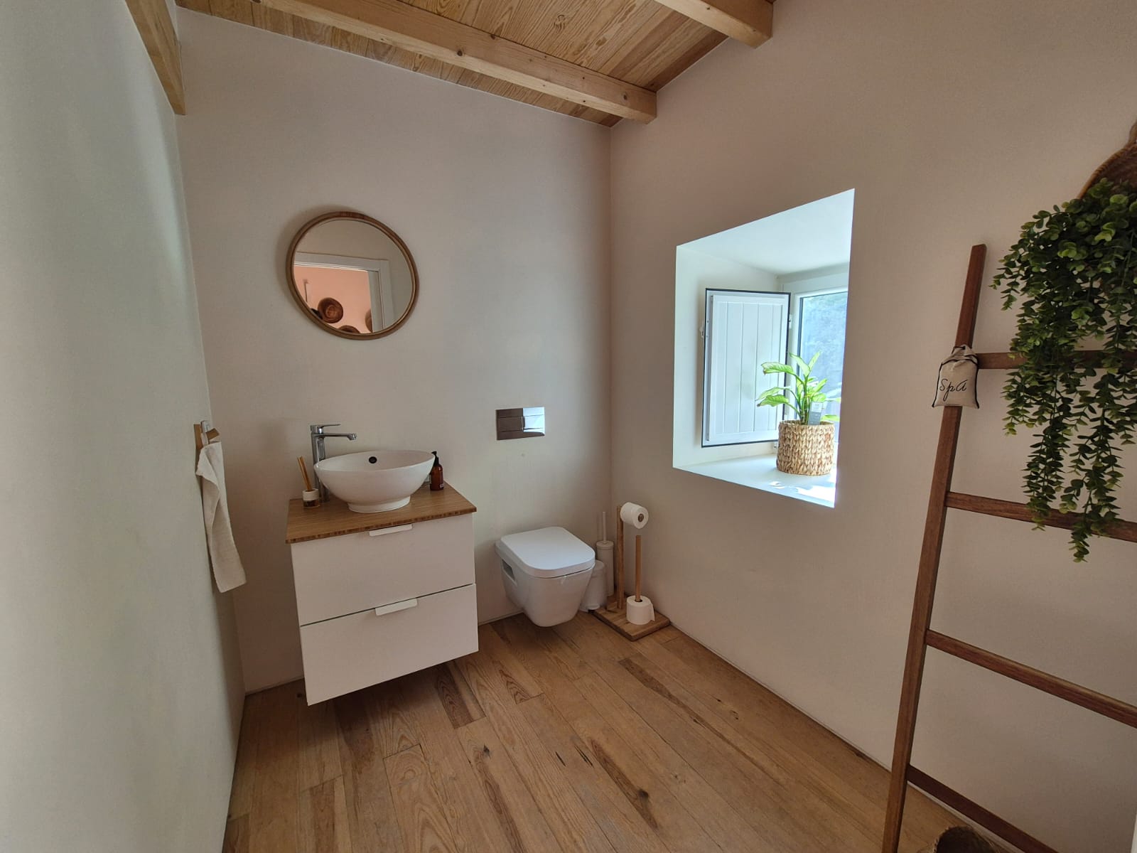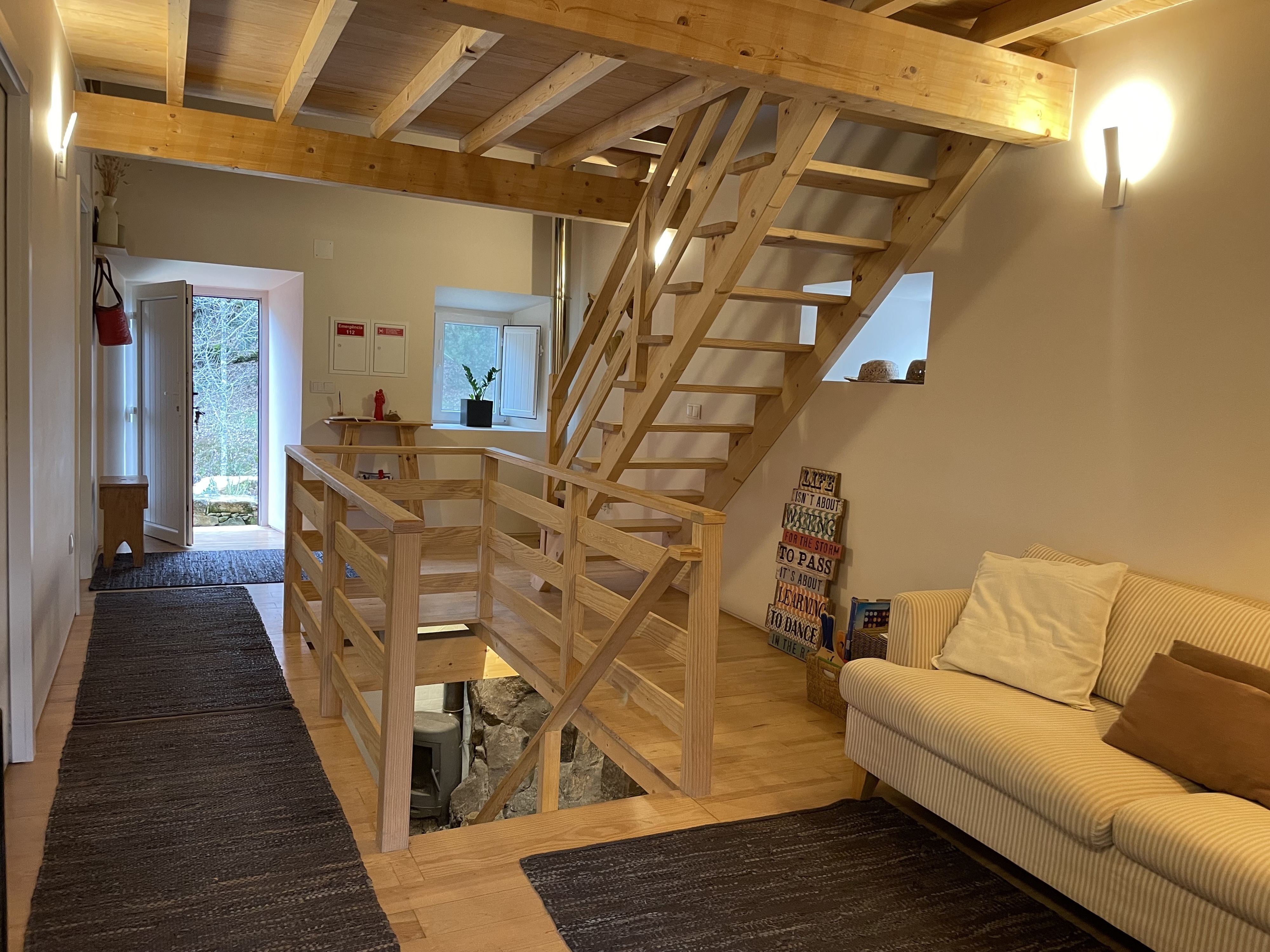 Já no piso inferior está a zona de convívio com cozinha e área de refeições, onde existe uma salamandra a lenha (lenha não incluída, apenas uma cesta de boas-vindas). A Beija Rio Charming House não tem máquina de loiça nem de roupa.