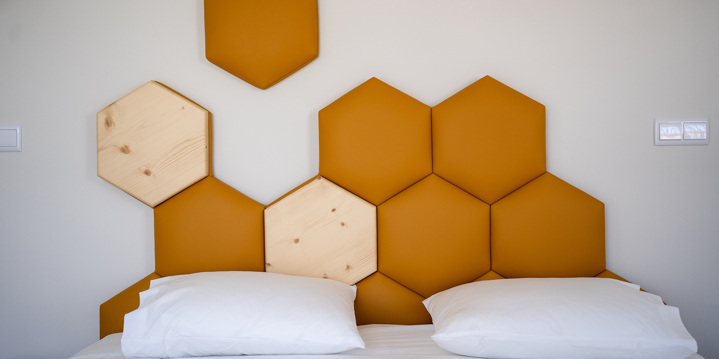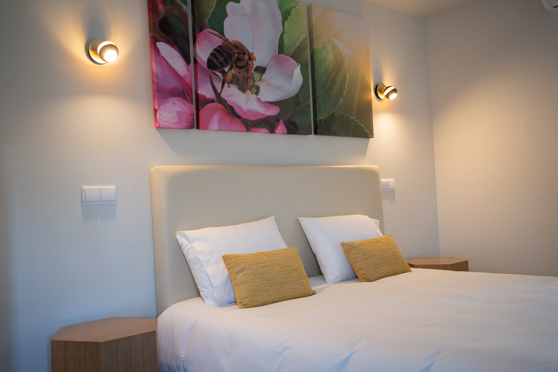 O resultado é um refúgio sereno e luminoso, onde o mel está em tudo — nos aromas, nas cores e nas experiências. Cada quarto tem uma decoração diferente, inspirada na natureza e na vida das abelhas. Há quartos duplos e triplos ideais para famílias, além de duas suítes com varanda privativa e vista aberta para a montanha.