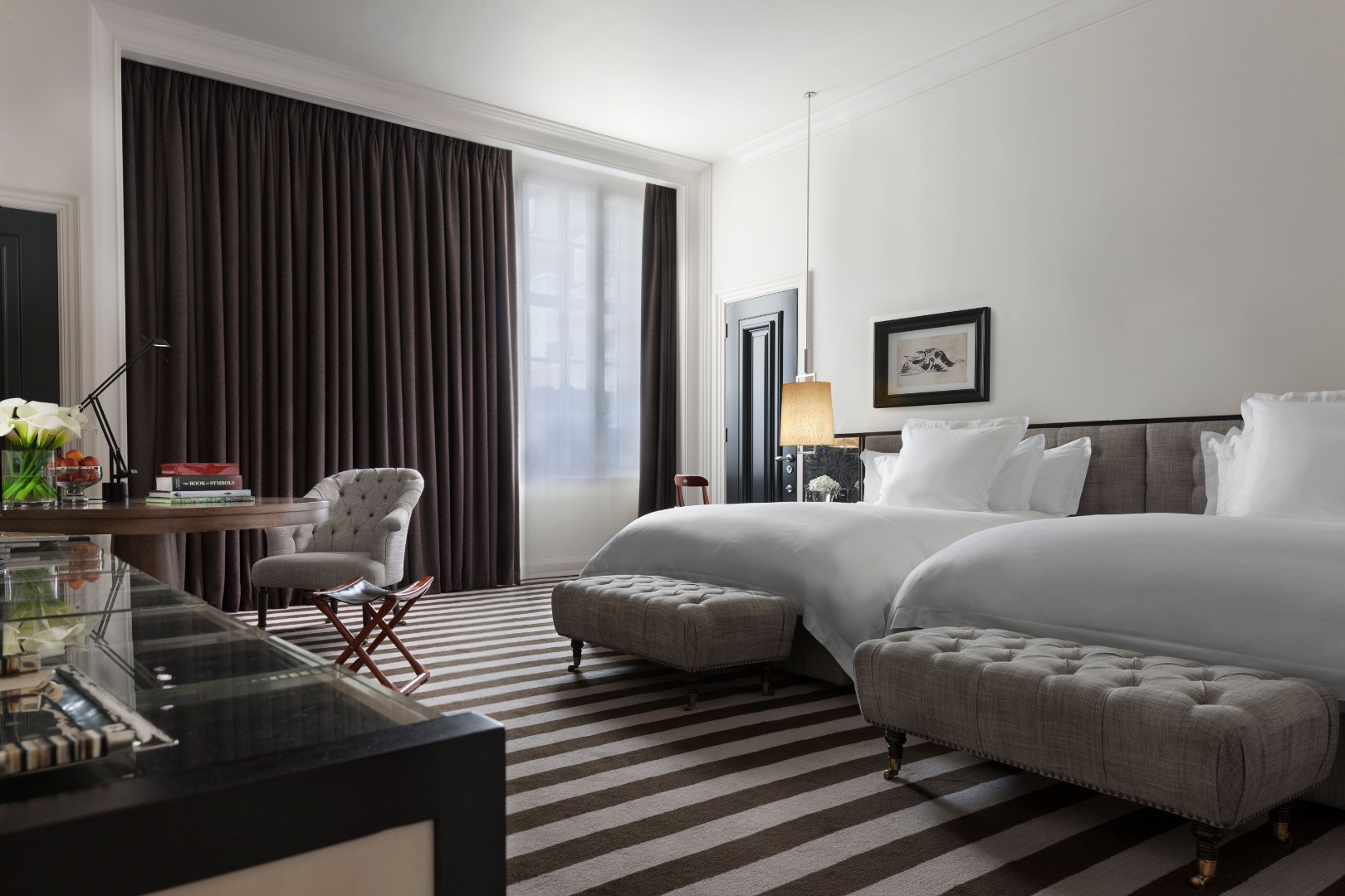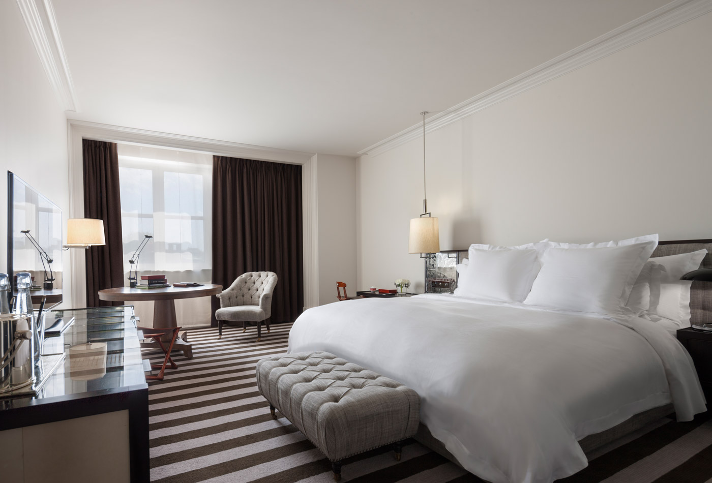 O ambiente é complementado por um serviço de mordomo 24 horas, minibar premium, seleção de vinhos e arranjos de flores frescas. Para quem não tem o orçamento de uma superestrela, o Rosewood oferece várias outras tipologias de alojamento, desde quartos executivos a suítes júnior, todas com casas de banho em mármore, lençóis de algodão egípcio e serviço de quarto permanente.