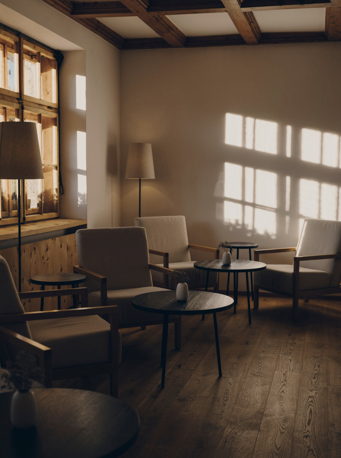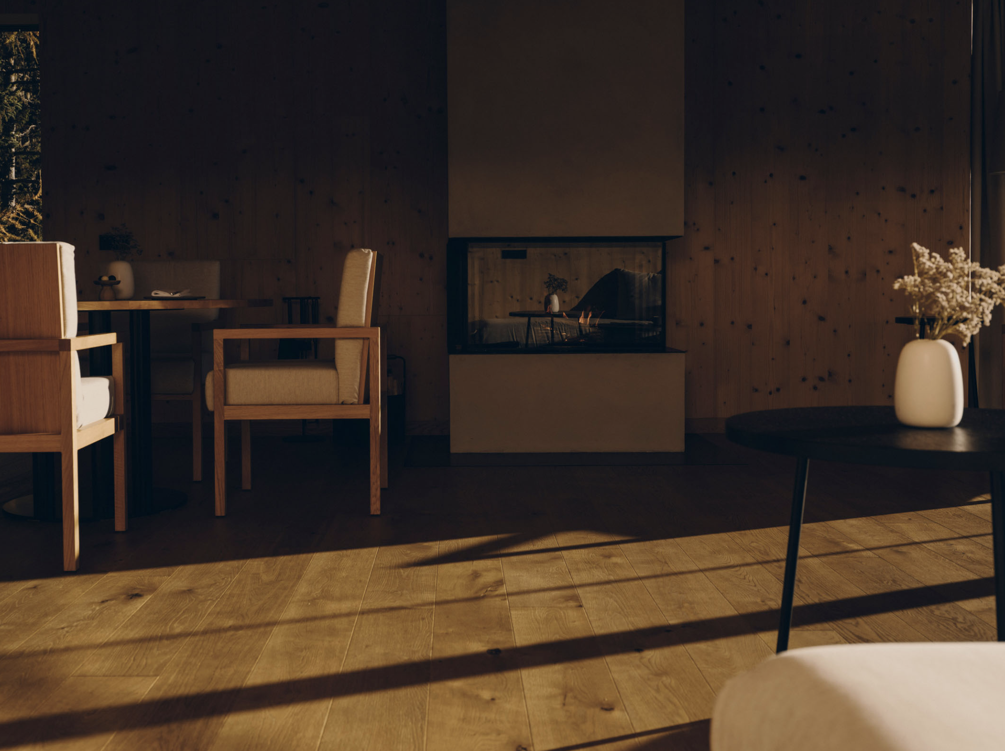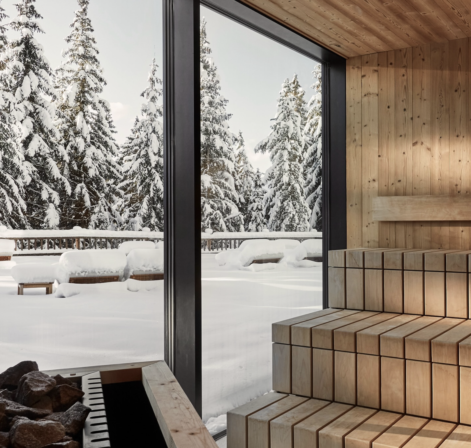 O bem-estar excede o quarto. O spa, com mais de 2.000 m², mistura tradição alpina com práticas de bem-estar modernas: piscinas interiores e exteriores com água da montanha, saunas de madeira, tratamentos com essências naturais, massagens, salas de silêncio e uma sala de ioga Wyda inspirada nas raízes celtas, pensada para quem procura corpo e mente em sintonia.