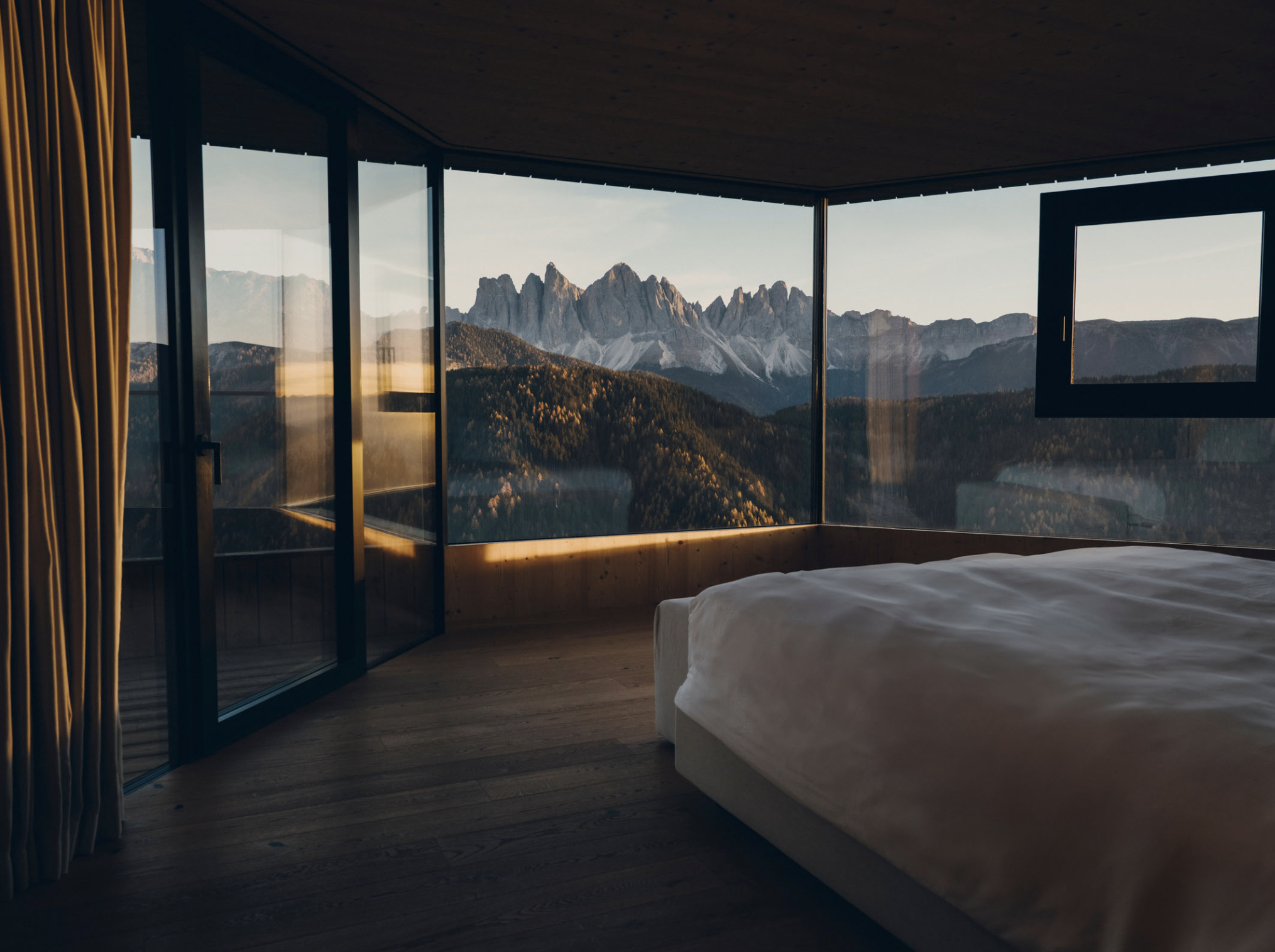 São 62 suítes, incluindo Tower Suites e Penthouses, todas projetadas para que o exterior seja protagonista. As janelas panorâmicas transformam os quartos em miradouros para as Dolomitas, com luz natural a inundar os espaços e um design que privilegia a sobriedade e conforto.