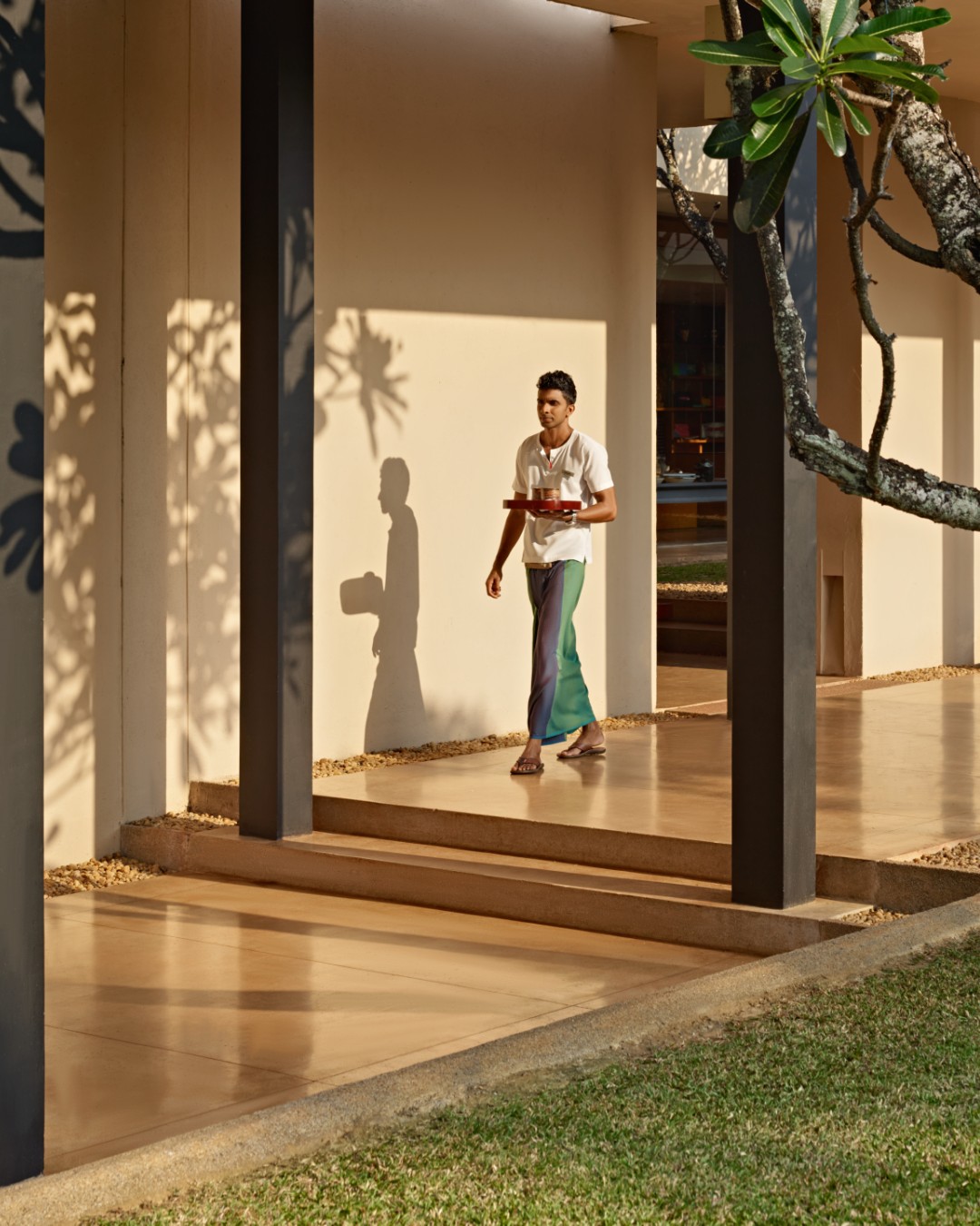 A escolha para esta fase da viagem foi o Amanwella, um dos resorts mais exclusivos do Sri Lanka, localizado perto de Tangalle, a cerca de uma hora de carro de Galle. Situado numa baía em forma de meia-lua e rodeado por coqueirais, o hotel pertence ao grupo Aman e conta apenas com 30 suítes, todas com piscina privada e vista para o oceano Índico, garantindo privacidade total e uma forte ligação à paisagem natural.