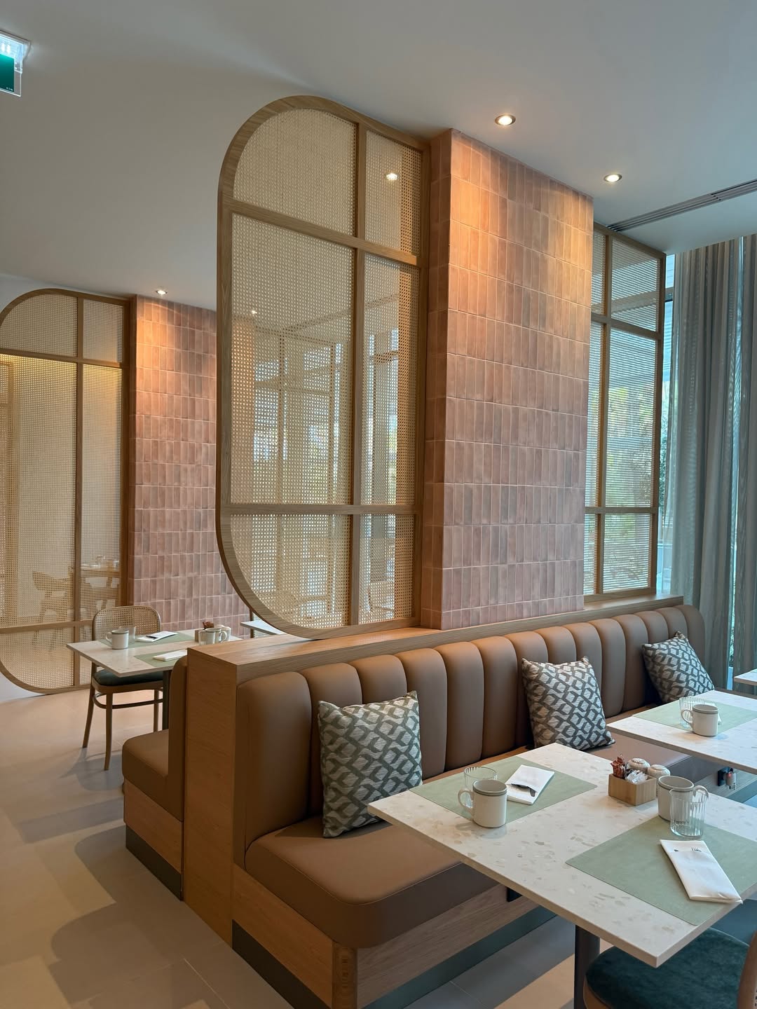 O design do resort é inspirado na paisagem costeira local, com materiais sustentáveis e o paisagismo inclui plantas autóctones e microclimas que favorecem biodiversidade e proporcionam sombras para passeios.