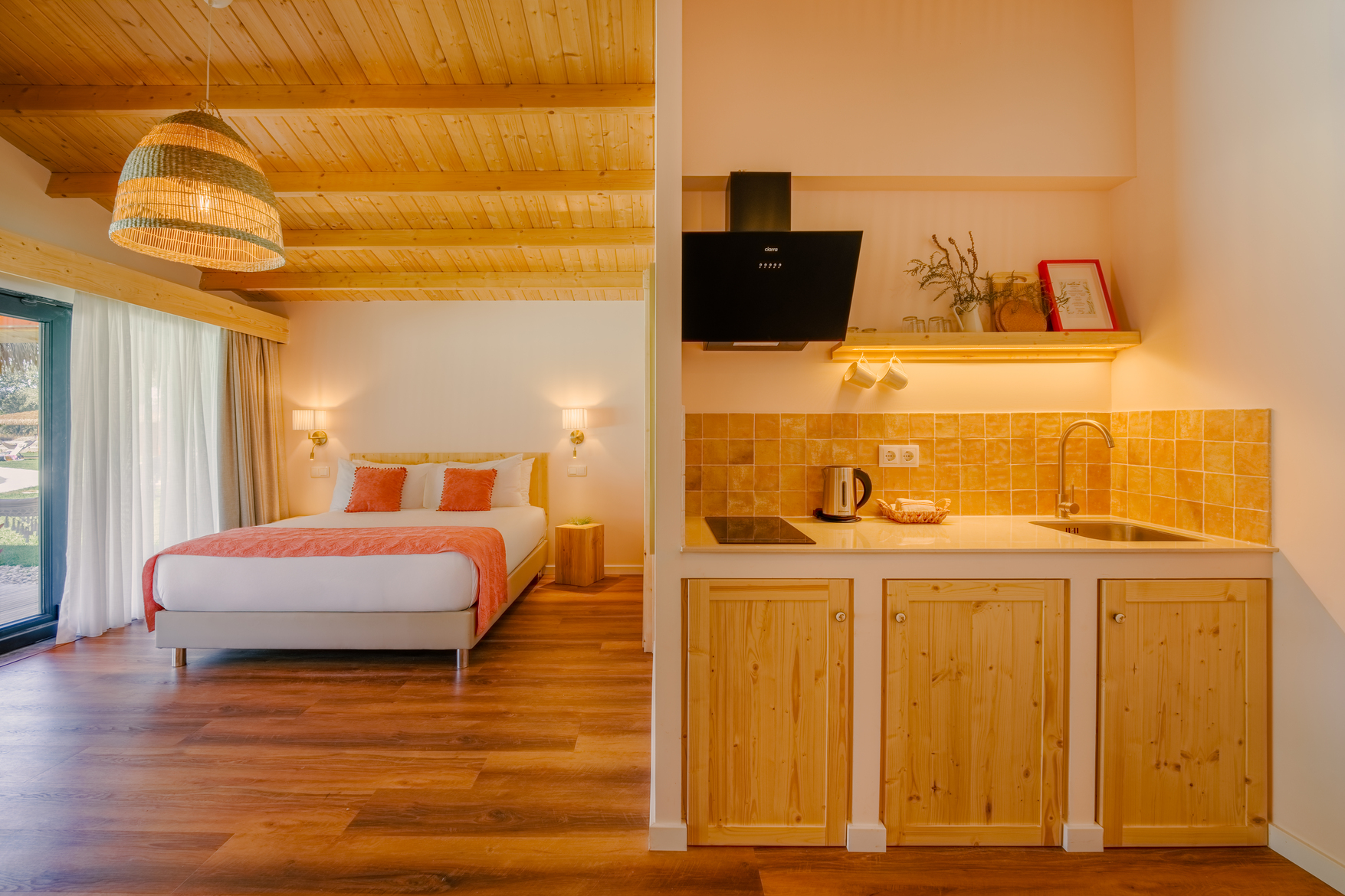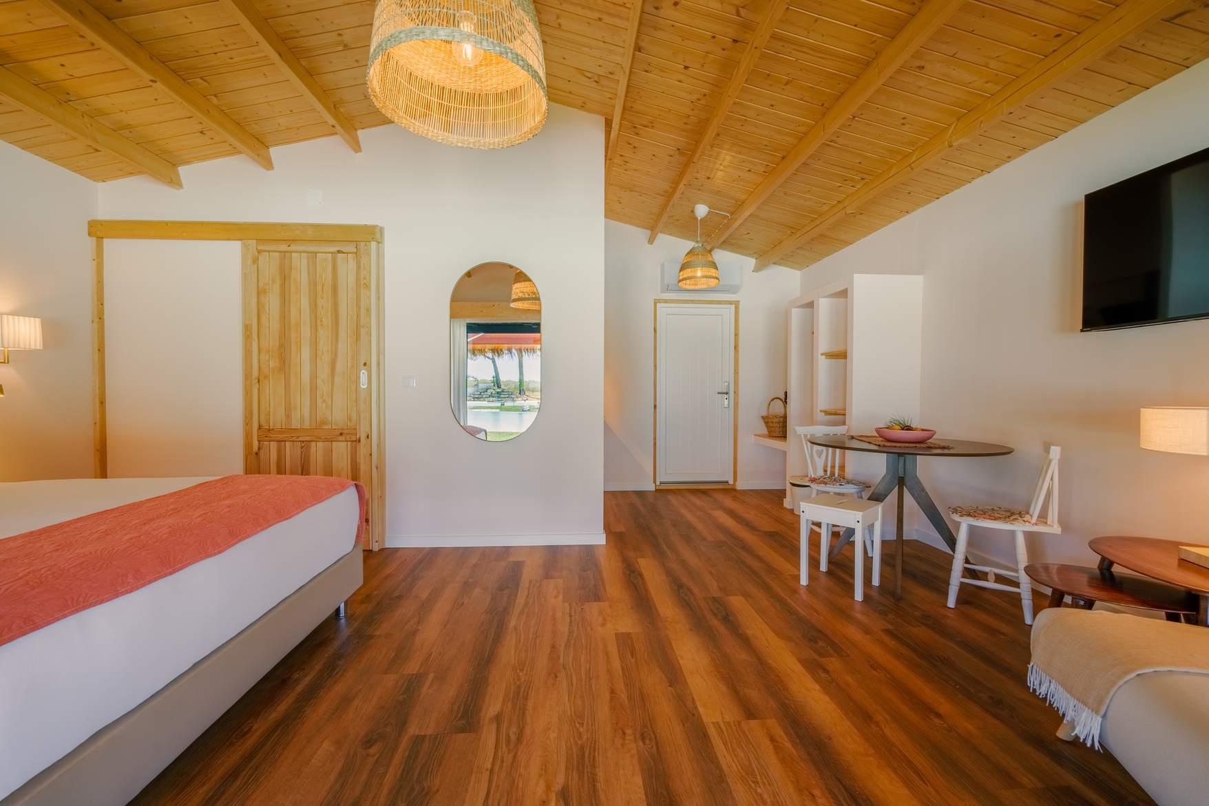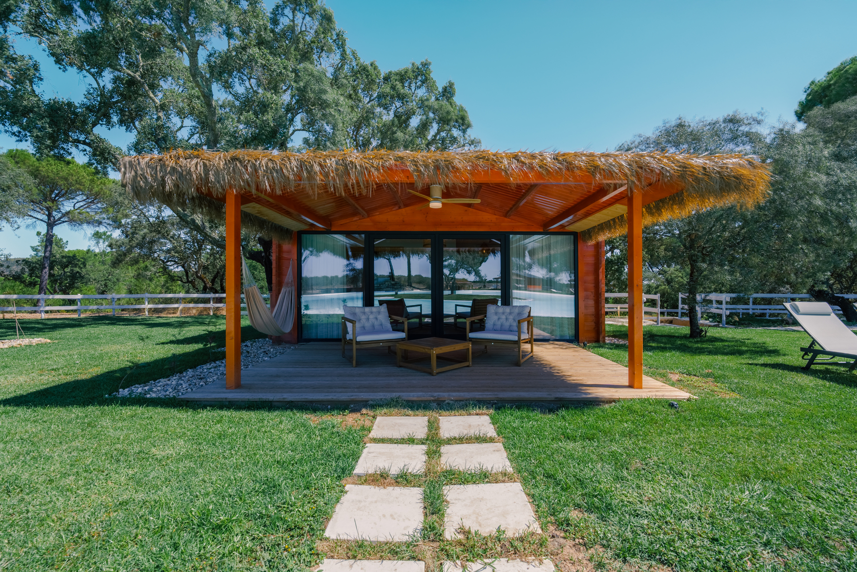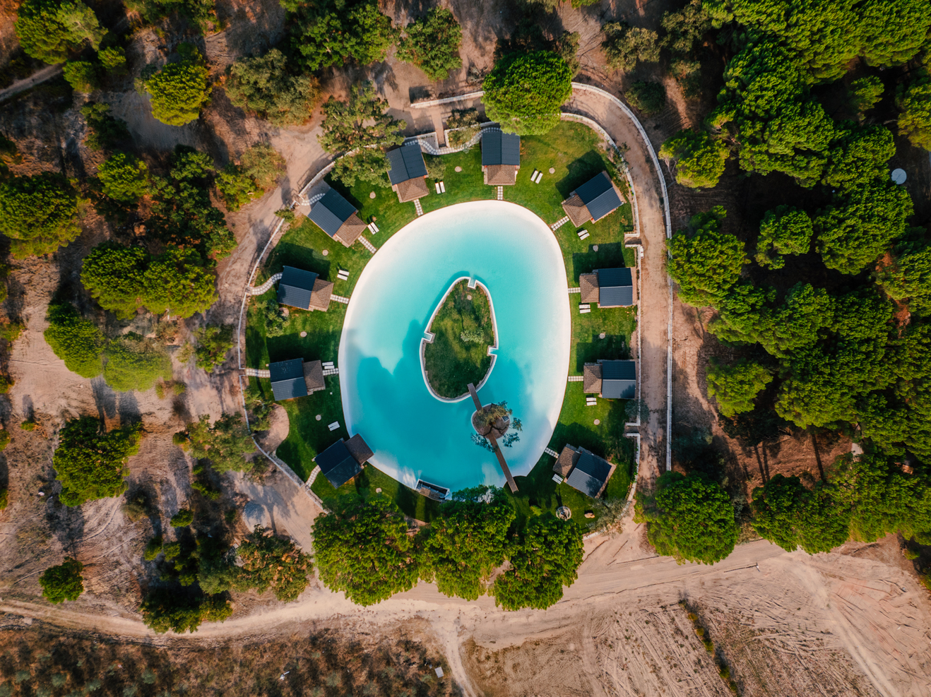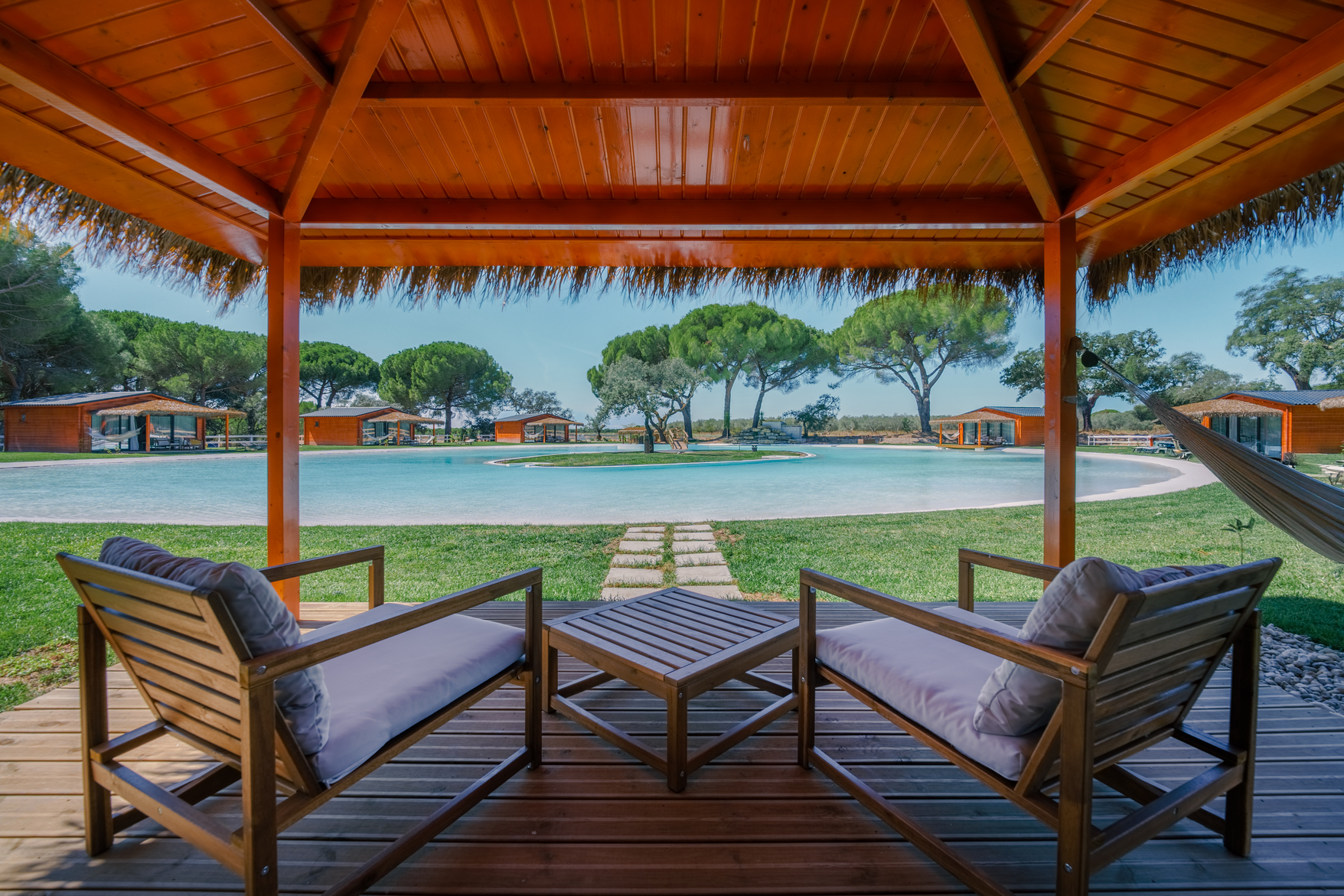 Cada bungalow está equipado com quarto e casa de banho, sala de estar, terraço e ar condicionado. As unidades têm entre 35 e 50 m², acomodando confortavelmente até 4 pessoas. A piscina-lago recém-inaugurada está disponível para todos os hóspedes e complementa as atividades de lazer ao ar livre.