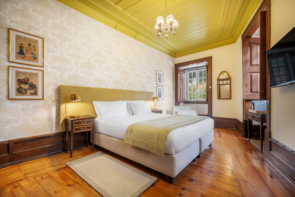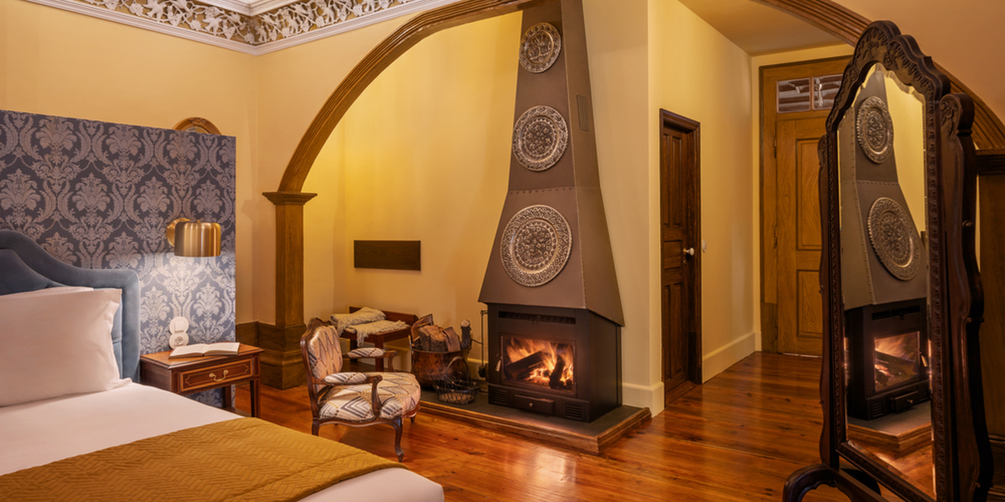 Além do calor aconchegante da lareira, na Suíte Rainha Santa Isabel pode contemplar o teto em relevo, enquanto está confortavelmente deitado numa cama digna de monarcas.