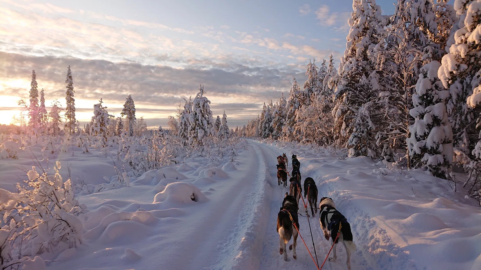 Um passeio num trenó puxado por cães husky é uma experiência emocionante que combina velocidade e contacto com a natureza. Guiados por mushers experientes, os visitantes aprendem a conduzir o trenó, cuidam dos cães e percorrem trilhos com paisagens de floresta e rios congelados. Preços a partir de 185€ no operador turístico All Huskies.